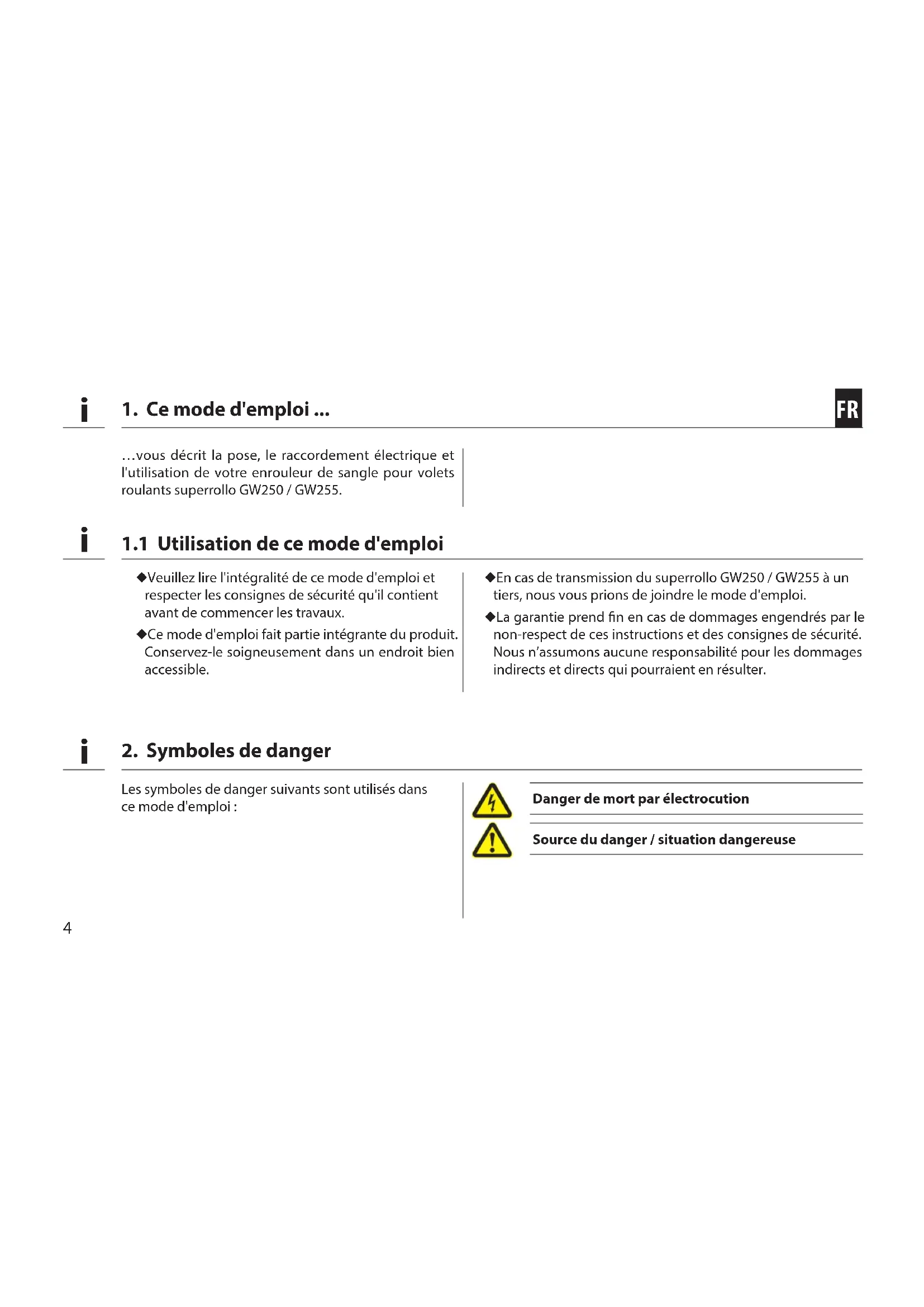 ...vous décrit la pose, le raccordement électrique et l'utilisation de votre enrouleur de sangle pour volets roulants superrollo GW250 / GW255.