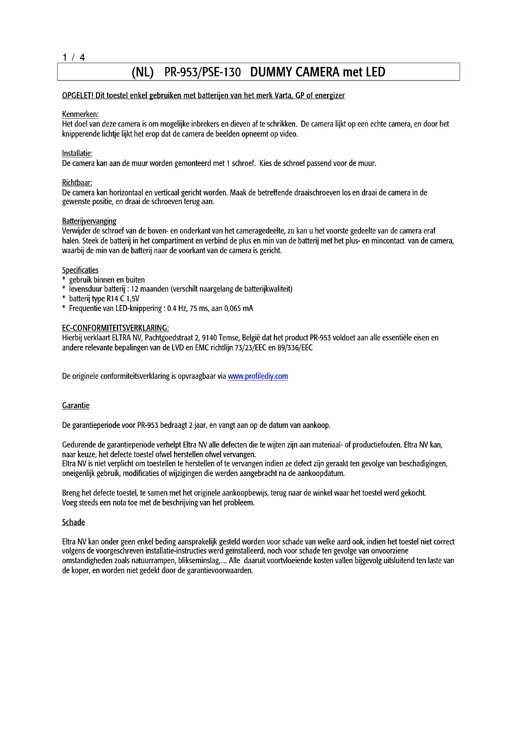 Par la présente la S.A.ELTRA NV, Pachtgoedstraat 2, 9140 Temse, Belgique déclare que l'appareil PR-953 est conforme aux exigences essentielles de la directive LVD et EMC 73/23/EEC et 89/336/EEC