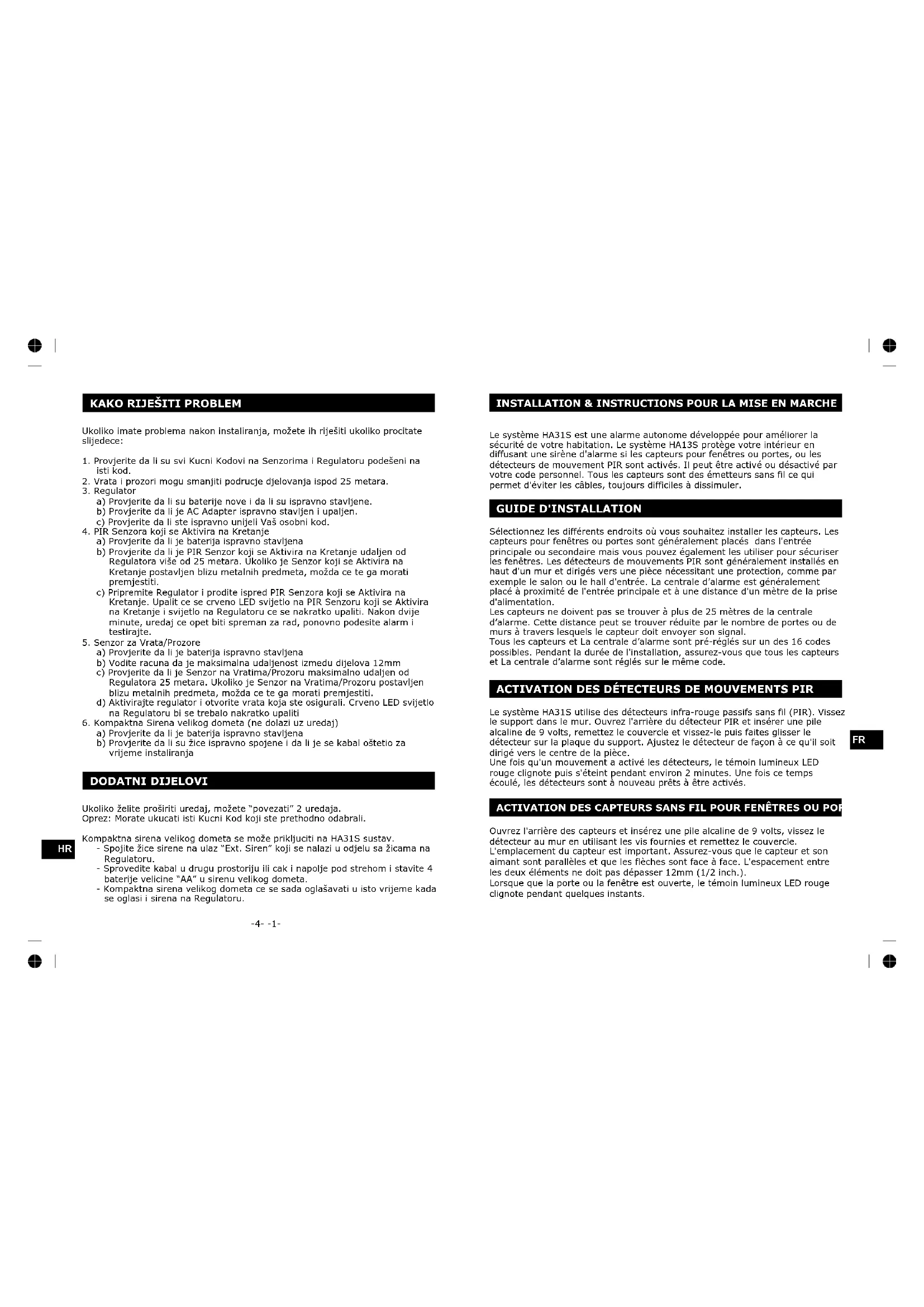 Prije no što instalirate regulator, zavnite dva vijka u zid tako da su 137 mm udaljeni jedan od drugog u horizontalnom položaju i u odgovarajućoj visini iznad poda, 1 metar udaljen od uticnice. Ukucavanje Kucnog Koda Dok ukucavate Kucni Kod, pritisnite prekidac "OFF" ili "ON", može se odabrati do 16 razlicitih kodova. Svaki Senzor ima slicne prekidace u odjelu za baterije na uredaju. Provjerite da li svi uredaji imaju ukucan isti Kucni Kod. Otvorite dio sa žicama na HA31S tako što odvrnete vijke ispod Regulatora i skinite poklopac. Ukljucite utikac iz AC Adaptera u uticnicu koja se nalazi unutar odjeljka. Vratite poklopac i zavrnite vijke. Otvorite Odjel za Baterlje na Regulatoru tako što odvrnete vijke koji se nalaze s donje strane. Stavite 3 nove baterije od alkalne stanice velicine "AA", vratite poklopac i zavrnite vijke (Sirena ce se oglasiti dva puta). Postavite regulator na prethodno pricvršcene vijke. Ukljucite AC Adapter. Vaš alarmni sustav je sada spreman za programiranje.