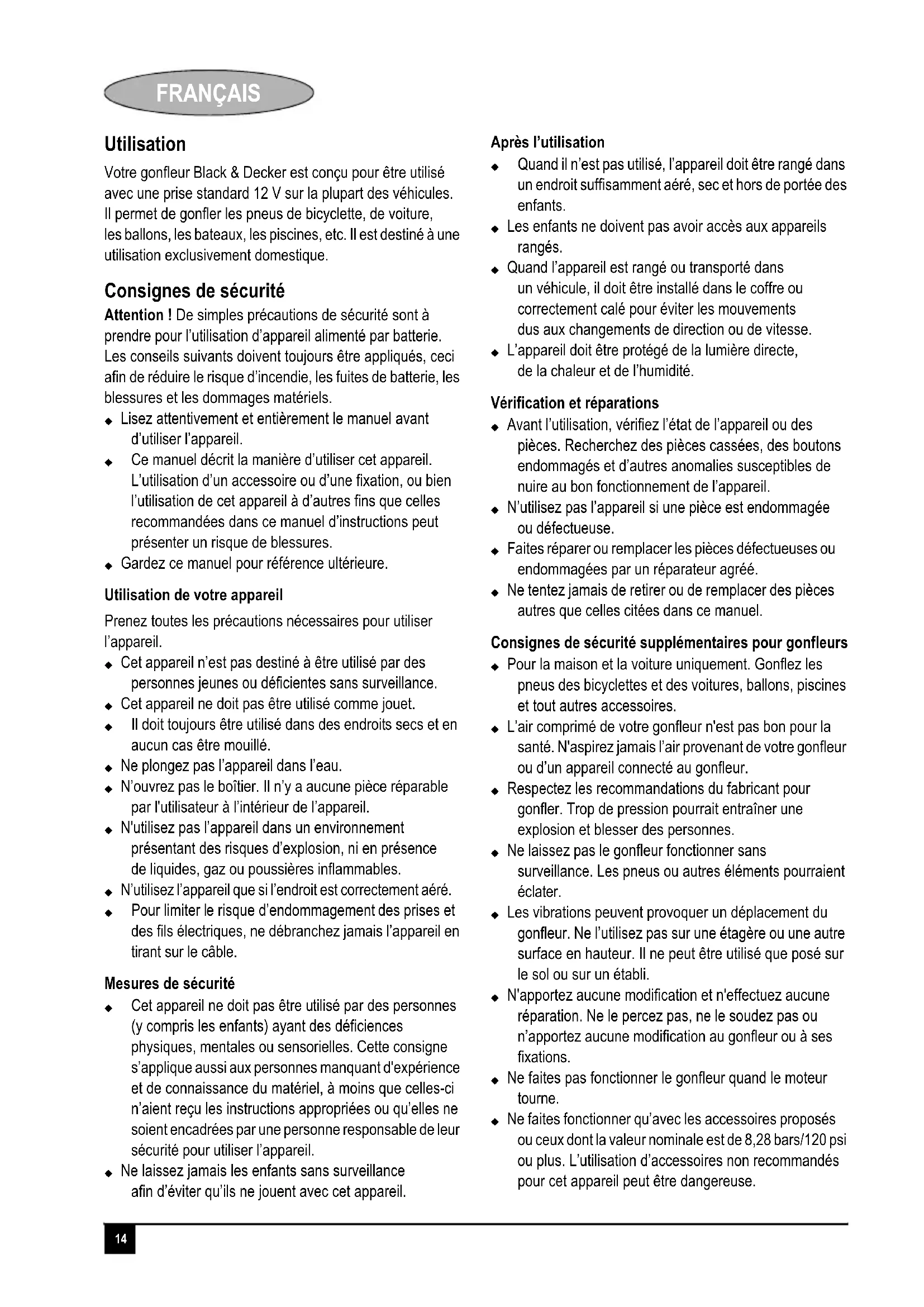 Ne laissez pas le gonflaur fonctionner sans surveillance. Les pneus ou autres éléments pourraient éclater.