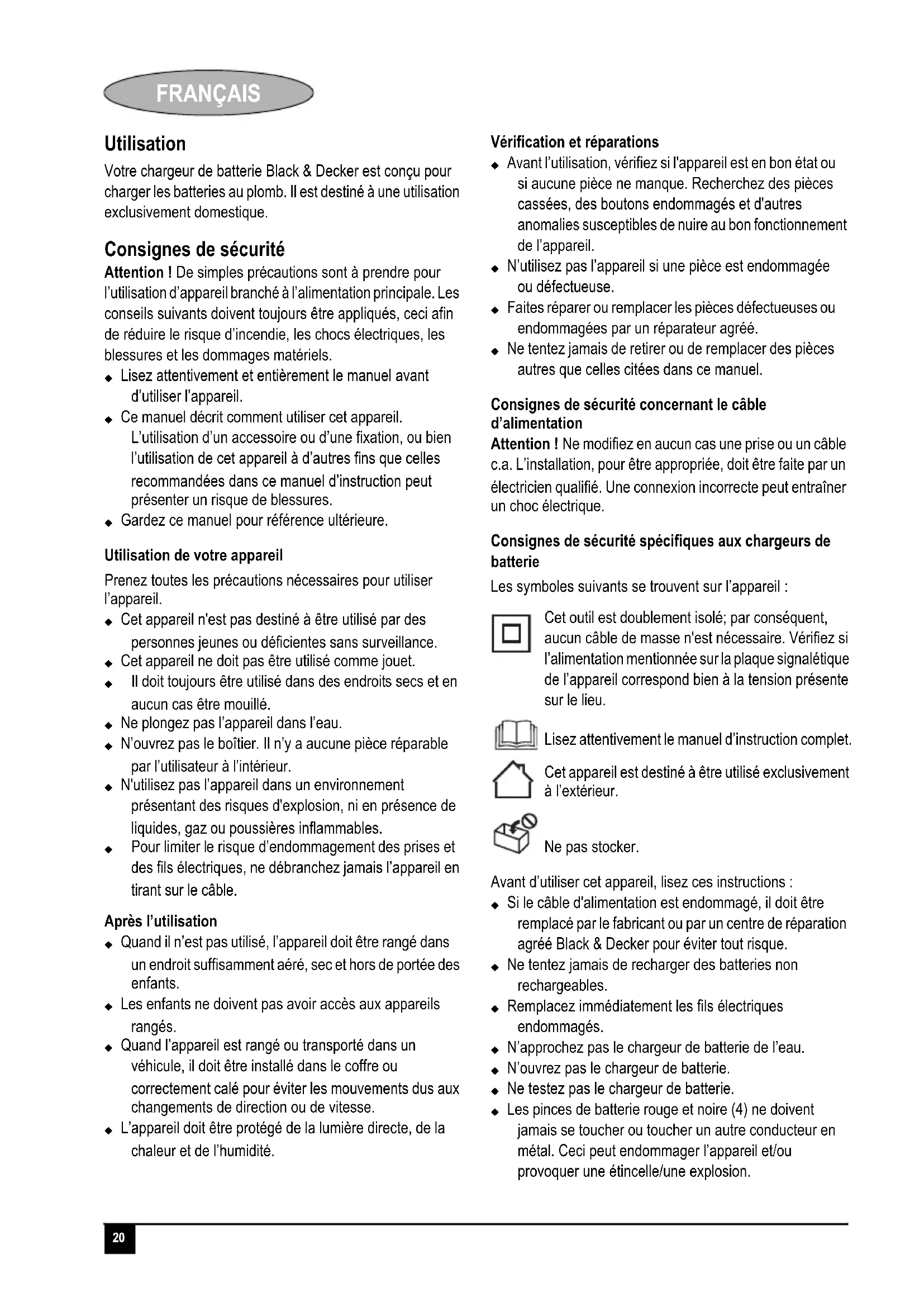 Votre chargeur de batterie Black & Decker est concu pour charger les batteries au plomb. Il est destiné à une'utilisation exclusivement domestique.