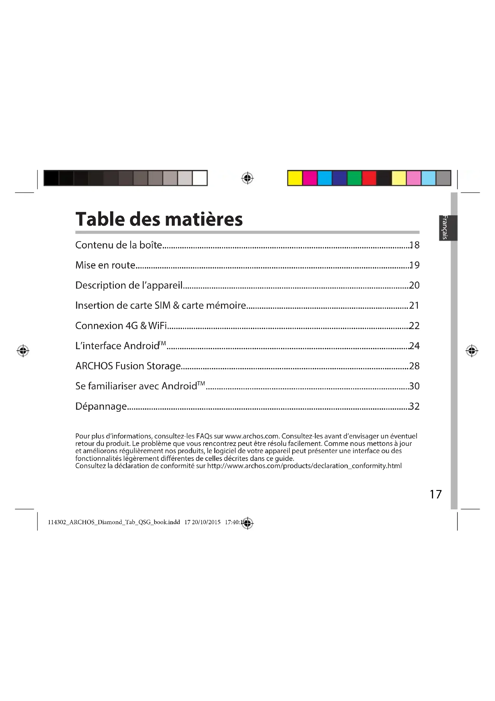 Appuyez sur le bouton reset en utilisant un objet pointu tel qu’un trombone. Ma tablette ne se connecte pas au réseau ou ache “Pas de service” Tentez de vous connecter à partir d’un autre endroit. Vériez la couverture réseau avec votre opérateur. Impossible de passer des appels Assurez-vous que votre tablette est connectée au réseau et que le réseau n’est ni saturé, ni indisponible. Impossible de recevoir des appels Assurez-vous que la tablette est allumée et connectée au réseau. Carte SIM bloquée (mauvais code PIN) Contactez votre opérateur réseau an d’obtenir le code PUK. Si votre réception WiFi est trop faible : Assurez-vous de ne pas être trop loin de la borne WiFi. Mettez à jour le logiciel du produit: http://www.archos.com/support. Réinitialisez vos paramètres de connexion WiFi. Contactez le fournisseur d’accès. 114302_ARCHOS_Diamond_Tab_QSG_book.indd 32 20/10/2015 17:40:1333 Deutsch Inhaltsverzeichnis Weitere Informationen nden Sie unter den FAQs unter www.archos.com. Bitte lesen Sie diese Informationen sorgfältig, bevor Sie die Rückgabe eines Produkts erwägen. Möglicherweise läßt sich Ihr Problem leicht lösen. Da unsere Produkte kontinuierlich aktualisiert und weiterentwickelt werden, kann die Software Ihres Geräts in Erscheinung und Funktionalität geringfügige Abweichungen zu den Darstellungen in dieser Kurzbedienungsanleitung aufweisen. Konsultieren Sie die Konformitätserklärung auf http://www.archos.com/products/declaration_conformity.html Beschreibung des Packungsinhalts................................................................................... Erste Schritte.............................................................................................................................. Beschreibung des Geräts....................................................................................................... Einlegen von SIM-Karte & Speicherkarte........................................................................ WLAN-Verbindung & 4G-Verbindung............................................................................... Die Android