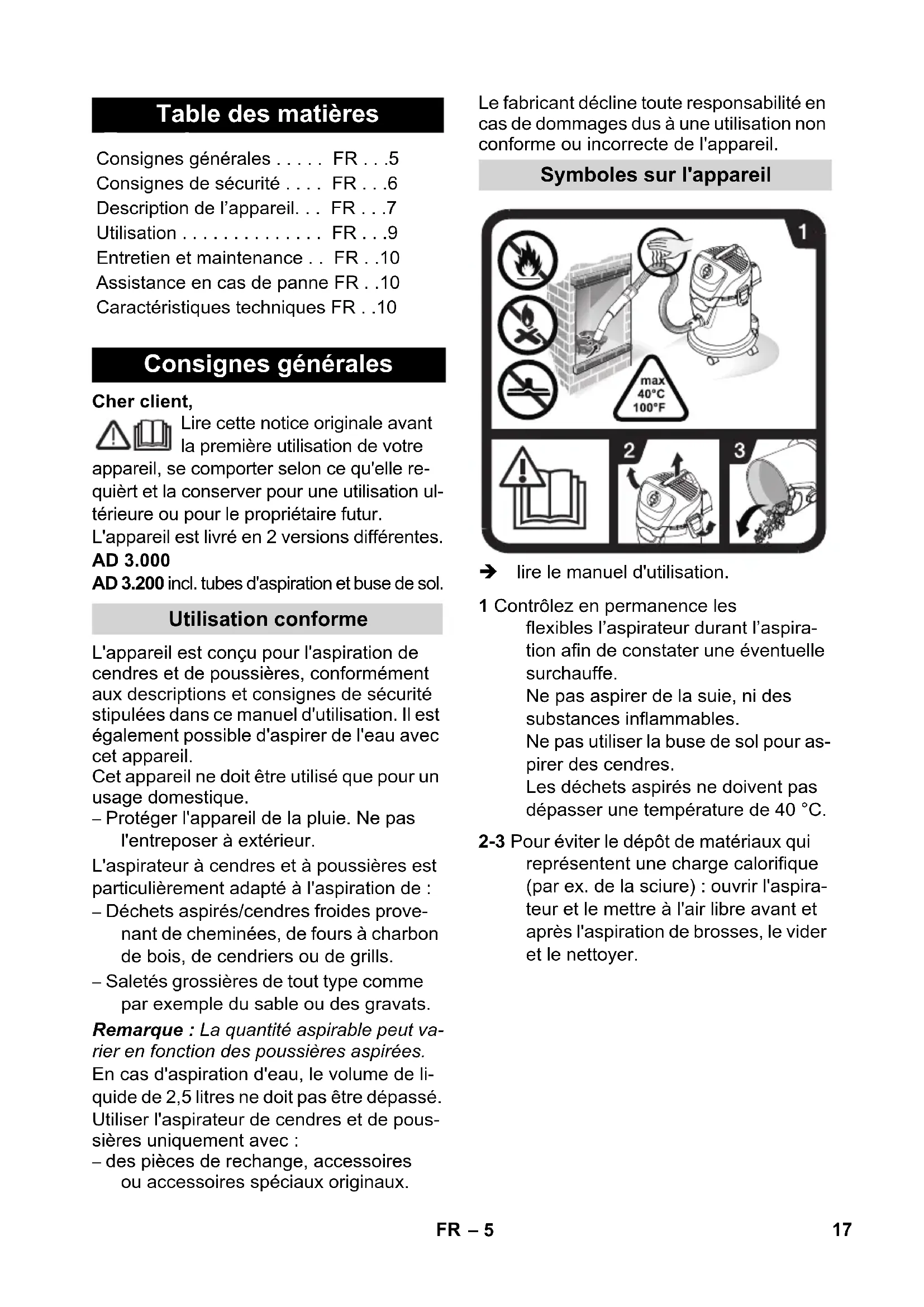 - Output P nom 1000 W Output P max 1200 W Protective class II Mains fuse (slow-blow) 10 A Container capacity 17 l Water intake with handle 2,5 l Water intake with floor nozzle 2,5 l Power cord H05VV-F 2x0.75 Sound pressure level (EN 60704-2-1) 73 dB(A) Weight (without accessories) 7,4 kg 16 ENFrançais – 5 Cher client, Lire cette notice originale avant la première utilisation de votre appareil, se comporter selon ce qu'elle re- quièrt et la conserver pour une utilisation ul- térieure ou pour le propriétaire futur. L'appareil est livré en 2 versions différentes. AD 3.000 AD 3.200 incl. tubes d'aspiration et buse de sol. L'appareil est conçu pour l'aspiration de cendres et de poussières, conformément aux descriptions et consignes de sécurité stipulées dans ce manuel d'utilisation. Il est également possible d'aspirer de l'eau avec cet appareil. Cet appareil ne doit être utilisé que pour un usage domestique. – Protéger l'appareil de la pluie. Ne pas l'entreposer à extérieur. L'aspirateur à cendres et à poussières est particulièrement adapté à l'aspiration de : – Déchets aspirés/cendres froides prove- nant de cheminées, de fours à charbon de bois, de cendriers ou de grills. – Saletés grossières de tout type comme par exemple du sable ou des gravats. Remarque : La quantité aspirable peut va- rier en fonction des poussières aspirées. En cas d'aspiration d'eau, le volume de li- quide de 2,5 litres ne doit pas être dépassé. Utiliser l'aspirateur de cendres et de pous- sières uniquement avec : – des pièces de rechange, accessoires ou accessoires spéciaux originaux. Le fabricant décline toute responsabilité en cas de dommages dus à une utilisation non conforme ou incorrecte de l'appareil. lire le manuel d'utilisation. Table des matières Consignes générales