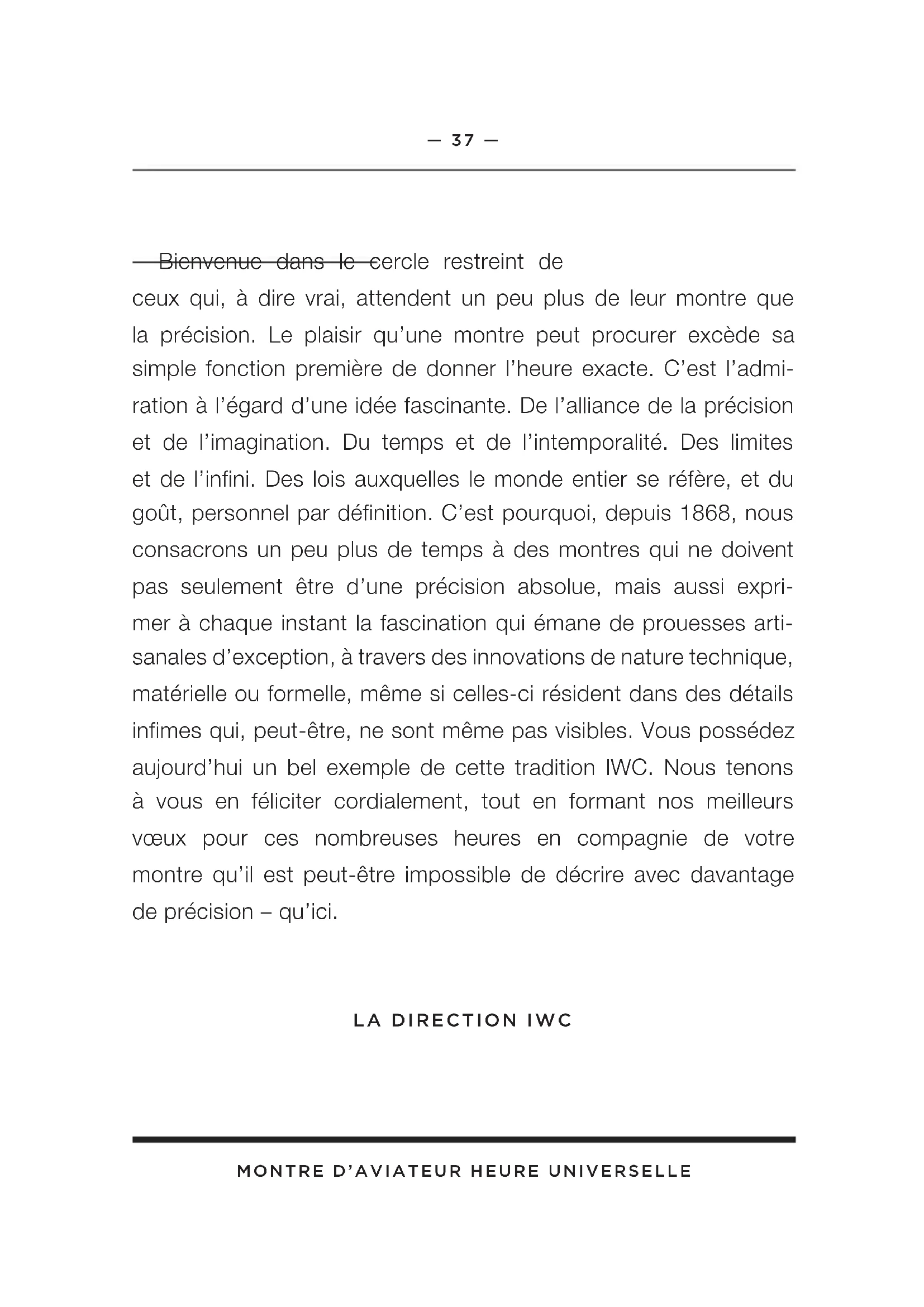 5— 40 — montre d’aviateur heure universelle les Fonctions de la couronne X — Position normale (couronne vissée) 0 — Position de remontage 1 — Réglage des heures et de la date 2 — Réglage de l’heure la position normale Cette montre possède une couronne vissée. Ce dispositif (posi- tion normale, X) empêche de dérégler involontairement l’heure, l’affichage des 24 heures du temps universel ou la date et, de sur- croît, il assure une double protection du boîtier contre les infiltra- tions d’eau. Pour libérer la couronne, il faut la tourner à gauche, ce qui la met automatiquement en position 0, la position de re- montage. Vous revisserez la couronne en exerçant une pression pour la ramener en position X tout en la tournant simultanément à droite, ce qui la verrouille. X 0 1 2— 41 — montre d’aviateur heure universelle la position de remontage Dans la position de remontage (0), vous pouvez aussi remonter manuellement le mouvement automatique. Quelques tours de la couronne suffisent à actionner le mouvement. Toutefois, nous recommandons de remonter la montre en faisant tourner environ 20 fois la couronne afin de garantir une précision maximale. le réglage des heures et de la date Libérez la couronne vissée et tirez-la en position 1. En tournant la couronne à gauche ou à droite, vous pouvez maintenant avancer ou reculer l’aiguille des heures par paliers d’une heure. Le mouve- ment ne s’arrête pas, la mise à l’heure en minutes et en secondes est conservée malgré cette correction. Si l’aiguille des heures franchit la zone de minuit, la date commute automatiquement à celle de la veille ou du lendemain. Cette fonction est utile pour le réglage de la date ou en franchissant des fuseaux horaires.— 42 — montre d’aviateur heure universelle Si le mois compte moins de 31 jours, vous devez avancer manuellement la date au premier jour du mois suivant. En tour- nant la couronne vers la gauche, vous pouvez faire avancer de 24 heures l’aiguille des heures par paliers d’une heure. Lors du passage de l’aiguille des heures à minuit, la date passera à la journée suivante. Vous aurez ainsi réglé l’affichage de l’heure d’un jour alors que le mouvement de la montre continuera à fonctionner. le réglage de l’heure Tirez la couronne en position 2. Cette opération arrête le mouve- ment. Pour un réglage à la seconde près, il est préférable d’arrê- ter le mouvement lorsque l’aiguille des secondes se trouve sur 60. Vous pouvez maintenant régler l’aiguille des minutes et l’affichage des 24 heures du temps universel (l’aiguille des heures étant mise à l’heure séparément au moyen de la position 1 de la couronne). Avancez alors l’aiguille des minutes de quelques traits au-delà de l’heure à régler. Positionnez ensuite l’aiguille des minutes par un léger mouvement en arrière exactement sur le trait des minutes désiré. Ce mode de réglage garantit que l’aiguille des minutes se déplacera immédiatement lors du redémarrage du mouvement. Pour faire démarrer le mouvement, il faut remettre la couronne en position 0.— 43 — montre d’aviateur heure universelle Important: dans les positions 0, 1 et 2, la montre est certes étanche, mais la couronne doit toujours être revissée (position X) avant toute utilisation normale. le Bon réglage de votre montre Pour régler correctement votre montre, veuillez procéder comme suit: – Déverrouillez la couronne en la tournant à gauche. – Remontez le mouvement (environ 20 tours de la couronne). – Tirez la couronne en position 2. Cette opération arrête le mouvement. Pour un réglage à la seconde près, il est préfé- rable d’arrêter le mouvement lorsque l’aiguille des secondes se trouve sur 60. – Tournez l’aiguille des minutes et l’affichage des 24 heures du temps universel vers l’avant jusqu’à ce qu’ils indiquent l’heure désirée. L’affichage des 24 heures du temps universel devrait être réglé de manière à ce que l’heure des différents fuseaux horaires soit correctement indiquée. Avancez alors l’aiguille des minutes de quelques traits au-delà de l’heure à régler. Po- sitionnez ensuite l’aiguille des minutes par un léger mouvement en arrière exactement sur le trait des minutes désiré. Ce mode de réglage garantit que l’aiguille des minutes se déplacera immédiatement lors du redémarrage du mouvement.— 44 — montre d’aviateur heure universelle – Pour faire démarrer le mouvement et ainsi l’aiguille des se- condes, il faut remettre la couronne en position 0. – Tirez la couronne en position 1. – Faites avancer ou reculer l’aiguille des heures par paliers d’une heure jusqu’à ce que l’affichage de la date indique celle du jour actuel. – En avançant l’aiguille des heures: l’aiguille est maintenant arrêtée entre minuit et 1 heure du matin. Faites maintenant avancer l’aiguille des heures jusqu’à l’heure exacte; si le réglage se fait l’après-midi, l’aiguille doit être avancée au-delà de 12 heures (midi). En reculant l’aiguille des heures: l’aiguille est maintenant arrêtée entre 23 heures et minuit. Faites maintenant reculer l’aiguille des heures jusqu’à l’heure exacte; si le réglage se fait le matin, l’aiguille doit être avancée au-delà de 12 heures (midi). – Enfoncez maintenant la couronne en position X et verrouillez-la en la tournant simultanément à droite.— 45 — montre d’aviateur heure universelle utc (universal time coordinated) Indépendamment de l’heure locale, le temps UTC est utilisé dans le monde entier comme base homogène pour les horaires d’avions. Le temps UTC constitue la base des contrôles inter- nationaux des opérations de la plupart des compagnies aériennes ainsi que de la sécurité aérienne. tzc (time zone corrector) Le globe a été divisé majoritairement en fuseaux horaires avec des écarts précis d’une 
