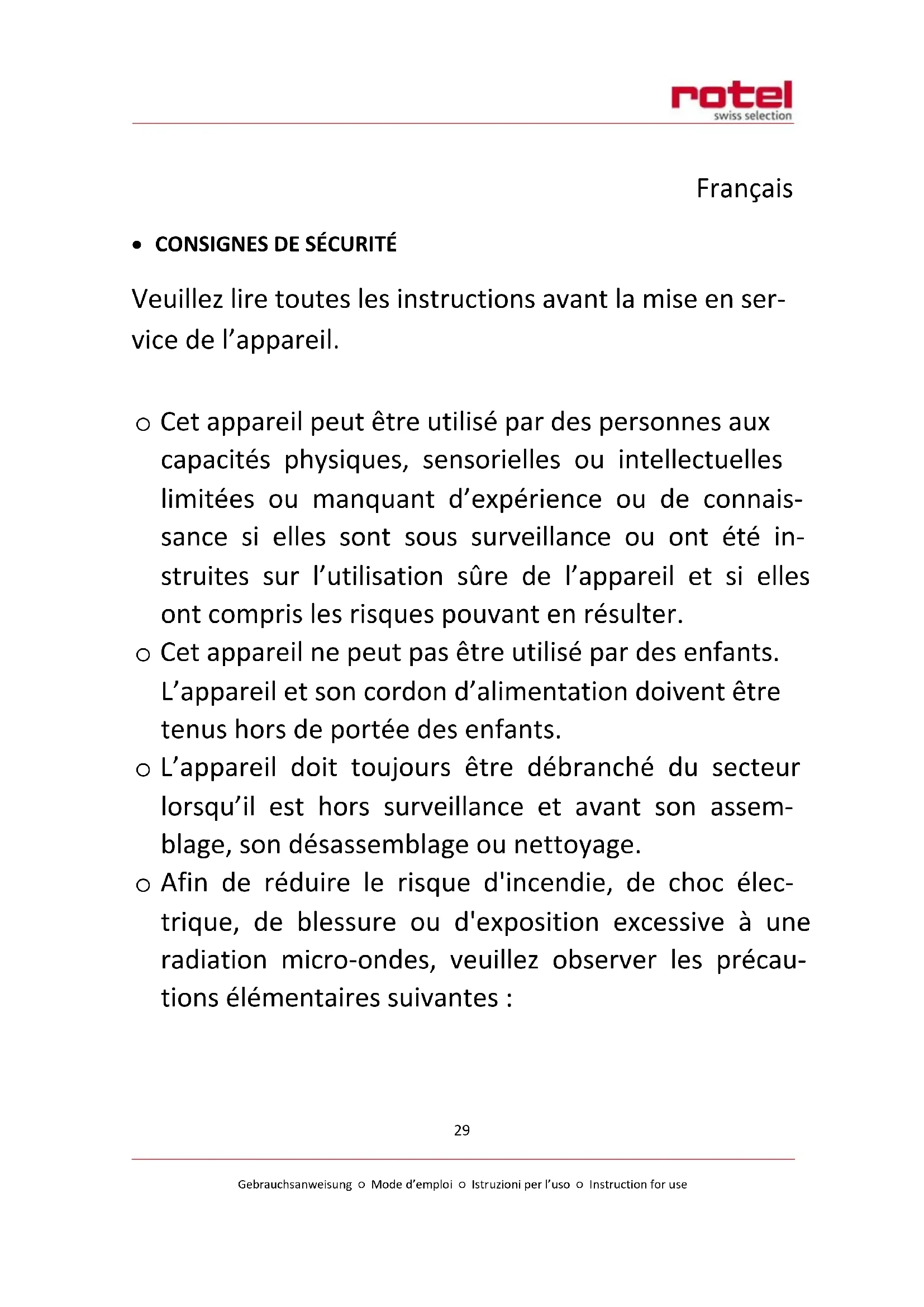 - Consignes de sécurité.... 29