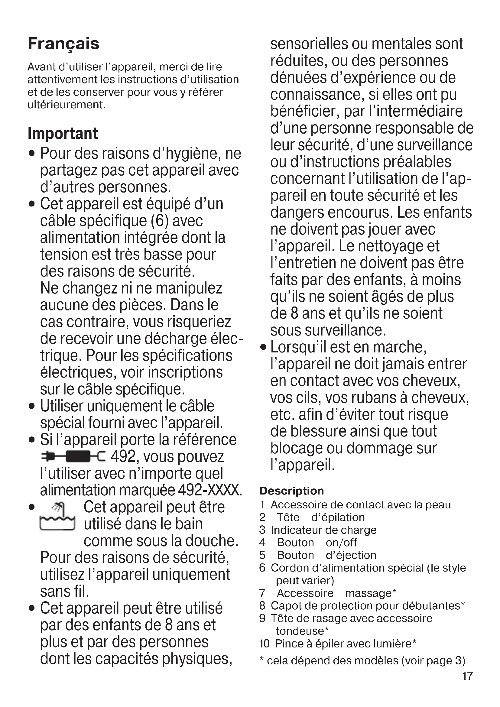 Lorsqu’il est en marche, l’appareil ne doit jamais entrer en contact avec vos cheveux, vos cils, vos rubans à cheveux, etc. afin d’éviter tout risque de blessure ainsi que tout blocage ou dommage sur l’appareil. Description 1 Accessoire de contact avec la peau 2 Tête d’épilation 3 Indicateur de charge 4 Bouton on/off 5 Bouton d’éjection 6 Cordon d’alimentation spécial (le style peut varier) 7 Accessoire massage* 8 Capot de protection pour débutantes* 9 Tête de rasage avec accessoire tondeuse* 0 Pince à épiler avec lumière*