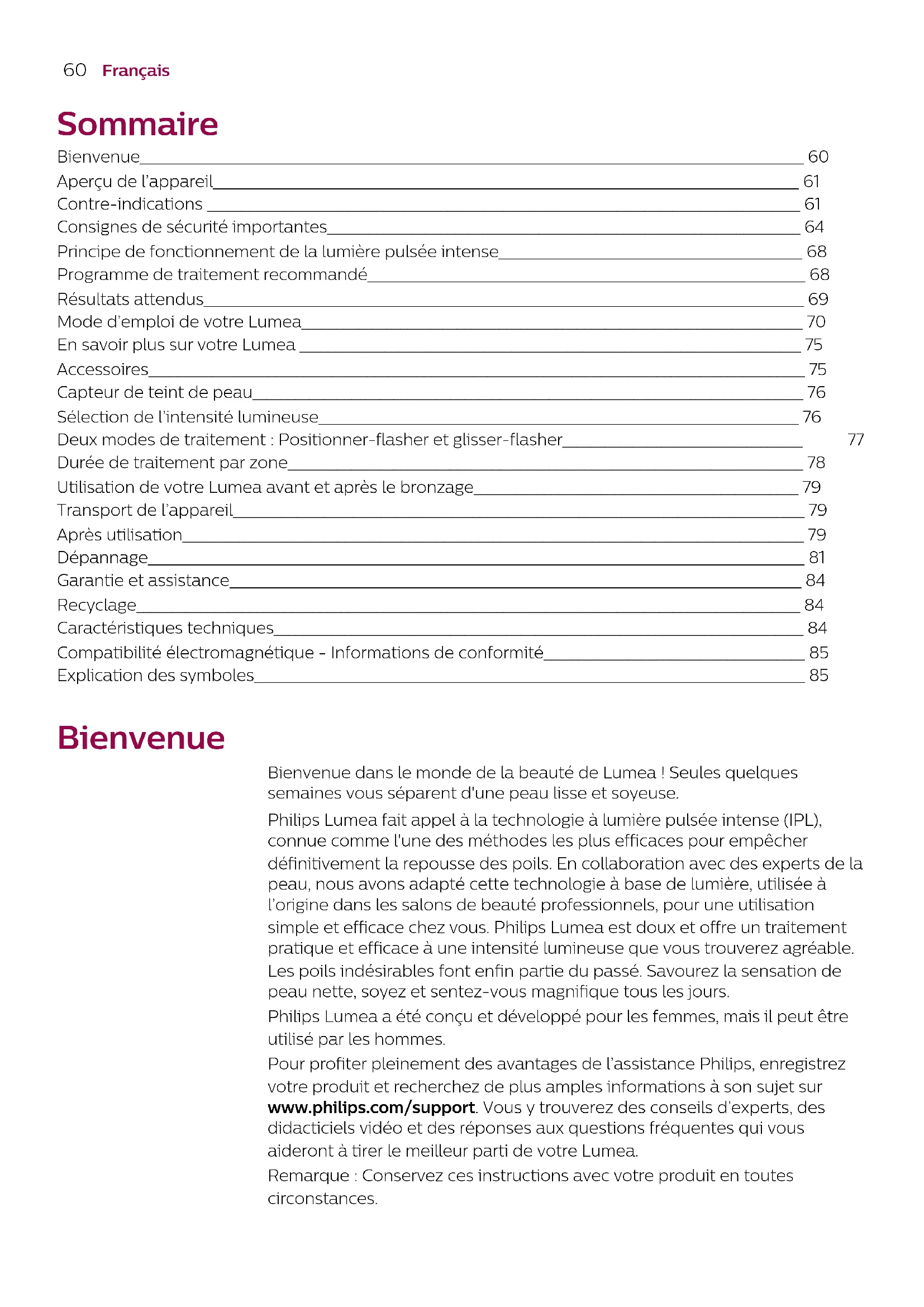 DeutschFrançais Sommaire Bienvenue______________________________________________________________________________________________ 60 Aperçu de l’appareil___________________________________________________________________________________ 61 Contre-indications ____________________________________________________________________________________ 61 Consignes de sécurité importantes___________________________________________________________________ 64 Principe de fonctionnement de la lumière pulsée intense___________________________________________ 68 Programme de traitement recommandé______________________________________________________________ 68 Résultats attendus_____________________________________________________________________________________ 69 Mode d’emploi de votre Lumea_______________________________________________________________________ 70 En savoir plus sur votre Lumea _______________________________________________________________________ 75 Accessoires_____________________________________________________________________________________________ 75 Capteur de teint de peau______________________________________________________________________________ 76 Sélection de l’intensité lumineuse____________________________________________________________________ 76 Deux modes de traitement: Positionner-flasher et glisser-flasher__________________________________ 77 Durée de traitement par zone_________________________________________________________________________ 78 Utilisation de votre Lumea avant et après le bronzage______________________________________________ 79 Transport de l’appareil_________________________________________________________________________________ 79 Après utilisation________________________________________________________________________________________ 79 Dépannage_____________________________________________________________________________________________ 81 Garantie et assistance_________________________________________________________________________________ 84 Recyclage______________________________________________________________________________________________ 84 Caractéristiques techniques___________________________________________________________________________ 84 Compatibilité électromagnétique - Informations de conformité_____________________________________ 85 Explication des symboles______________________________________________________________________________ 85 Bienvenue Bienvenue dans le monde de la beauté de Lumea! Seules quelques semaines vous séparent d'une peau lisse et soyeuse. Philips Lumea fait appel à la technologie à lumière pulsée intense (IPL), connue comme l'une des méthodes les plus efficaces pour empêcher définitivement la repousse des poils. En collaboration avec des experts de la peau, nous avons adapté cette technologie à base de lumière, utilisée à l’origine dans les salons de beauté professionnels, pour une utilisation simple et efficace chez vous. Philips Lumea est doux et offre un traitement pratique et efficace à une intensité lumineuse que vous trouverez agréable. Les poils indésirables font enfin partie du passé. Savourez la sensation de peau nette, soyez et sentez-vous magnifique tous les jours. PhilipsLumea a été conçu et développé pour les femmes, mais il peut être utilisé par les hommes. Pour profiter pleinement des avantages de l’assistance Philips, enregistrez votre produit et recherchez de plus amples informations à son sujet sur www.philips.com/support. Vous y trouverez des conseils d’experts, des didacticiels vidéo et des réponses aux questions fréquentes qui vous aideront à tirer le meilleur parti de votre Lumea. Remarque: Conservez ces instructions avec votre produit en toutes circonstances.