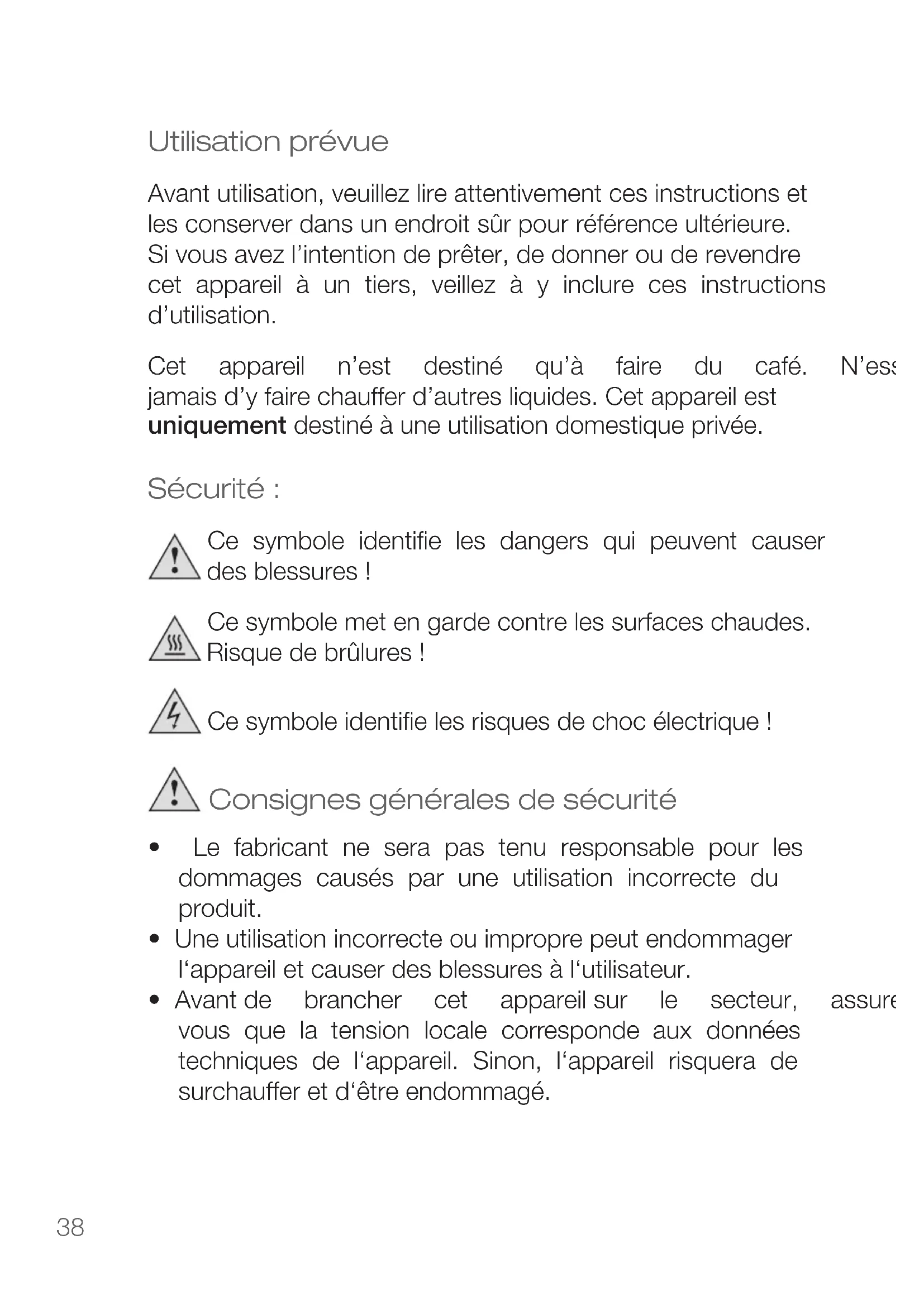 Cet appareil n'est destiné qu'à faire du café. N'ess jamais d'y faire chauffer d'autres liquides. Cet appareil est uniquement destiné à une utilisation domestique privée.