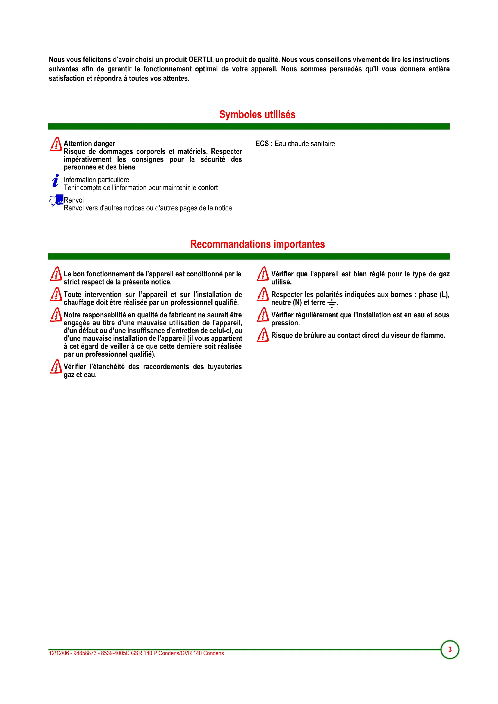 - Défauts Notice allemande référence 300000854-001 disponible sur demande3 12/12/06 - 94858873 - 8539-4005C GSR 140 P Condens/GVR 140 Condens Nous vous félicitons d'avoir choisi un produit OERTLI, un produit de qualité. Nous vous conseillons vivement de lire les instructions suivantes afin de garantir le fonctionnement optimal de votre appareil. Nous sommes persuadés qu'il vous donnera entière satisfaction et répondra à toutes vos attentes. Symboles utilisés p. 13