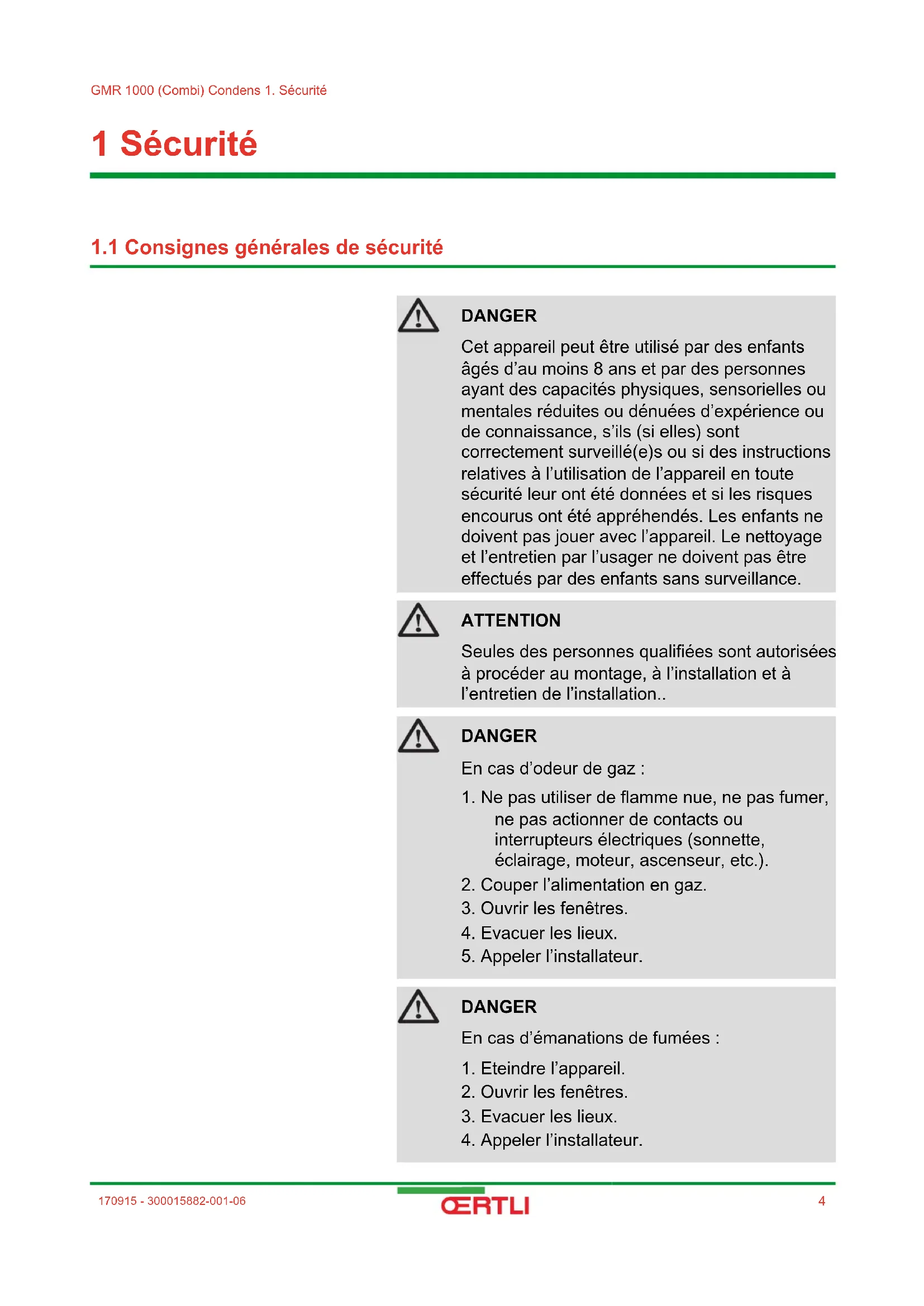 DANGER Cet appareil peut être utilisé par des enfants âgés d’au moins 8 ans et par des personnes ayant des capacités physiques, sensorielles ou mentales réduites ou dénuées d’expérience ou de connaissance, s’ils (si elles) sont correctement surveillé(e)s ou si des instructions relatives à l’utilisation de l’appareil en toute sécurité leur ont été données et si les risques encourus ont été appréhendés. Les enfants ne doivent pas jouer avec l’appareil. Le nettoyage et l’entretien par l’usager ne doivent pas être effectués par des enfants sans surveillance. ATTENTION Seules des personnes qualifiées sont autorisées à procéder au montage, à l’installation et à l’entretien de l’installation.. DANGER En cas d’odeur de gaz :