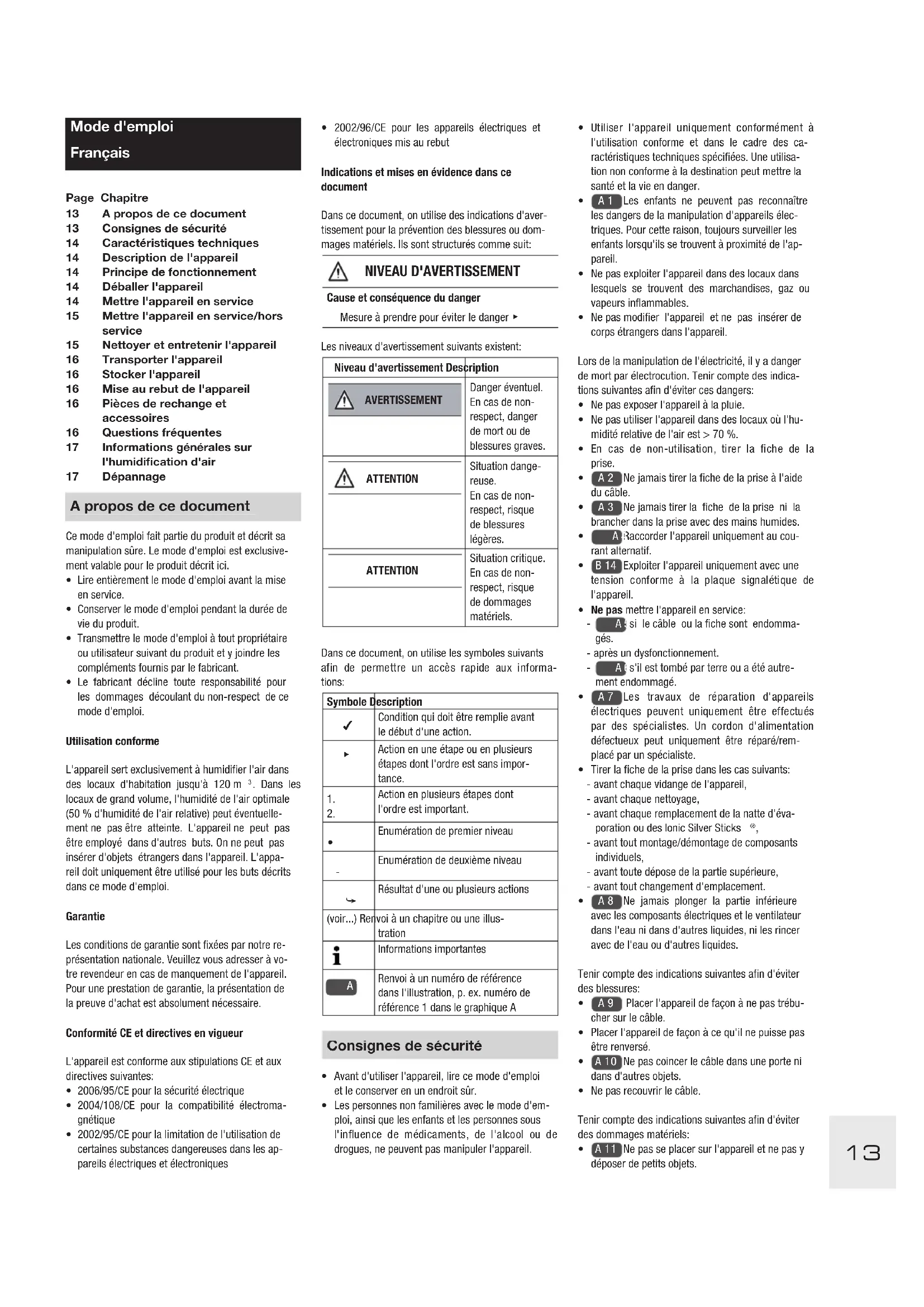 13 A propos de ce document 13 Consignes de sécurité 14 Caractéristiques techniques 14 Description de l'appareil 14 Principe de fonctionnement 14 Déballer l'appareil 14 Mettre l'appareil en service 15 Mettre l'appareil en service/hors service 15 Nettoyer et entretenir l'appareil 16 Transporter l'appareil 16 Stocker l'appareil 16 Mise au rebut de l'appareil 16 Pièces de rechange et accessoires 16 Questions fréquentes 17 Informations générales sur l'humidification d'air 17 Dépannage