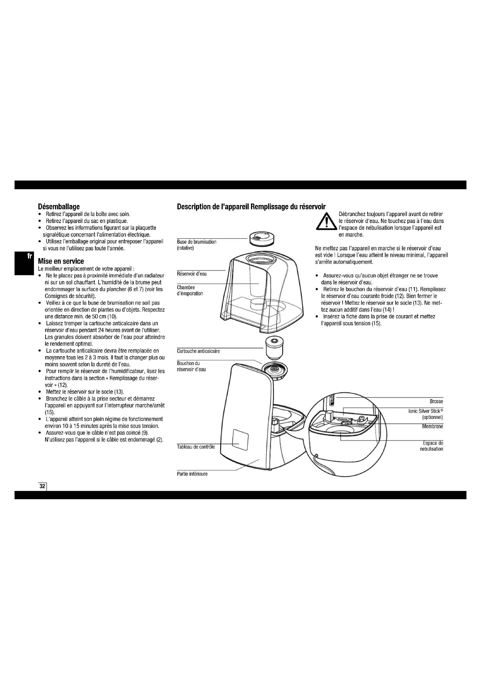 (optionnel) Busedebrumisation (rotative) Chambre d’évaporation Réservoird’eau Brosse Cartoucheanticalcaire Partie inférieure Tableaudecontrôle Bouchondu réservoird’eau Espacede nebulisation33