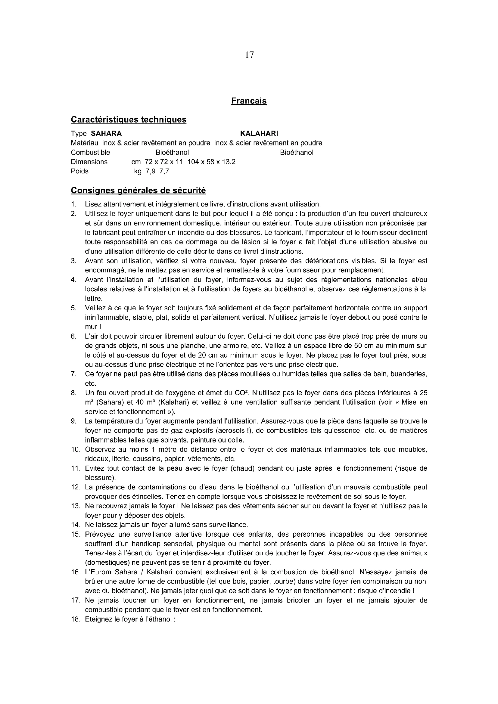 16. L’Eurom Sahara / Kalahari convient exclusivement à la combustion de bioéthanol. N’essayez jamais de