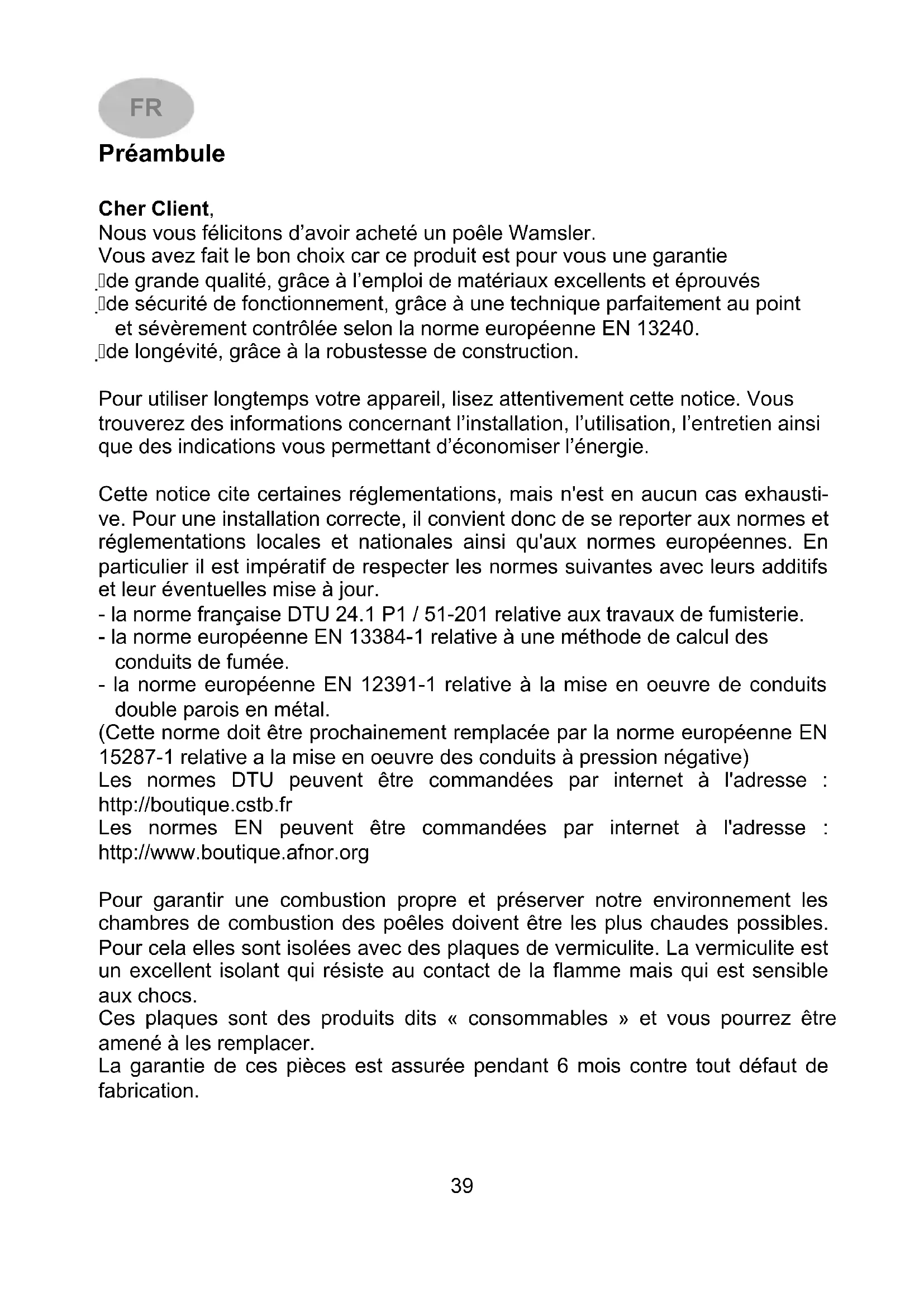 We reserve the right to make changes which relate to technical advances and / or to an improve- ment in quality. We accept no liability for printing errors and changes which occur after printing.39 Préambule Cher Client, Nous vous félicitons d’avoir acheté un poêle Wamsler. Vous avez fait le bon choix car ce produit est pour vous une garantie de grande qualité, grâce à l’emploi de matériaux excellents et éprouvés de sécurité de fonctionnement, grâce à une technique parfaitement au point et sévèrement contrôlée selon la norme européenne EN 13240. de longévité, grâce à la robustesse de construction. Pour utiliser longtemps votre appareil, lisez attentivement cette notice. Vous trouverez des informations concernant l’installation, l’utilisation, l’entretien ainsi que des indications vous permettant d’économiser l’énergie. Cette notice cite certaines réglementations, mais n'est en aucun cas exhausti- ve. Pour une installation correcte, il convient donc de se reporter aux normes et réglementations locales et nationales ainsi qu'aux normes européennes. En particulier il est impératif de respecter les normes suivantes avec leurs additifs et leur éventuelles mise à jour. - la norme française DTU 24.1 P1 / 51-201 relative aux travaux de fumisterie. - la norme européenne EN 13384-1 relative à une méthode de calcul des conduits de fumée. - la norme européenne EN 12391-1 relative à la mise en oeuvre de conduits double parois en métal. (Cette norme doit être prochainement remplacée par la norme européenne EN 15287-1 relative a la mise en oeuvre des conduits à pression négative) Les normes DTU peuvent être commandées par internet à l'adresse : http://boutique.cstb.fr Les normes EN peuvent être commandées par internet à l'adresse : http://www.boutique.afnor.org Pour garantir une combustion propre et préserver notre environnement les chambres de combustion des poêles doivent être les plus chaudes possibles. Pour cela elles sont isolées avec des plaques de vermiculite. La vermiculite est un excellent isolant qui résiste au contact de la flamme mais qui est sensible aux chocs. Ces plaques sont des produits dits « consommables » et vous pourrez être amené à les remplacer. La garantie de ces pièces est assurée pendant 6 mois contre tout défaut de fabrication.