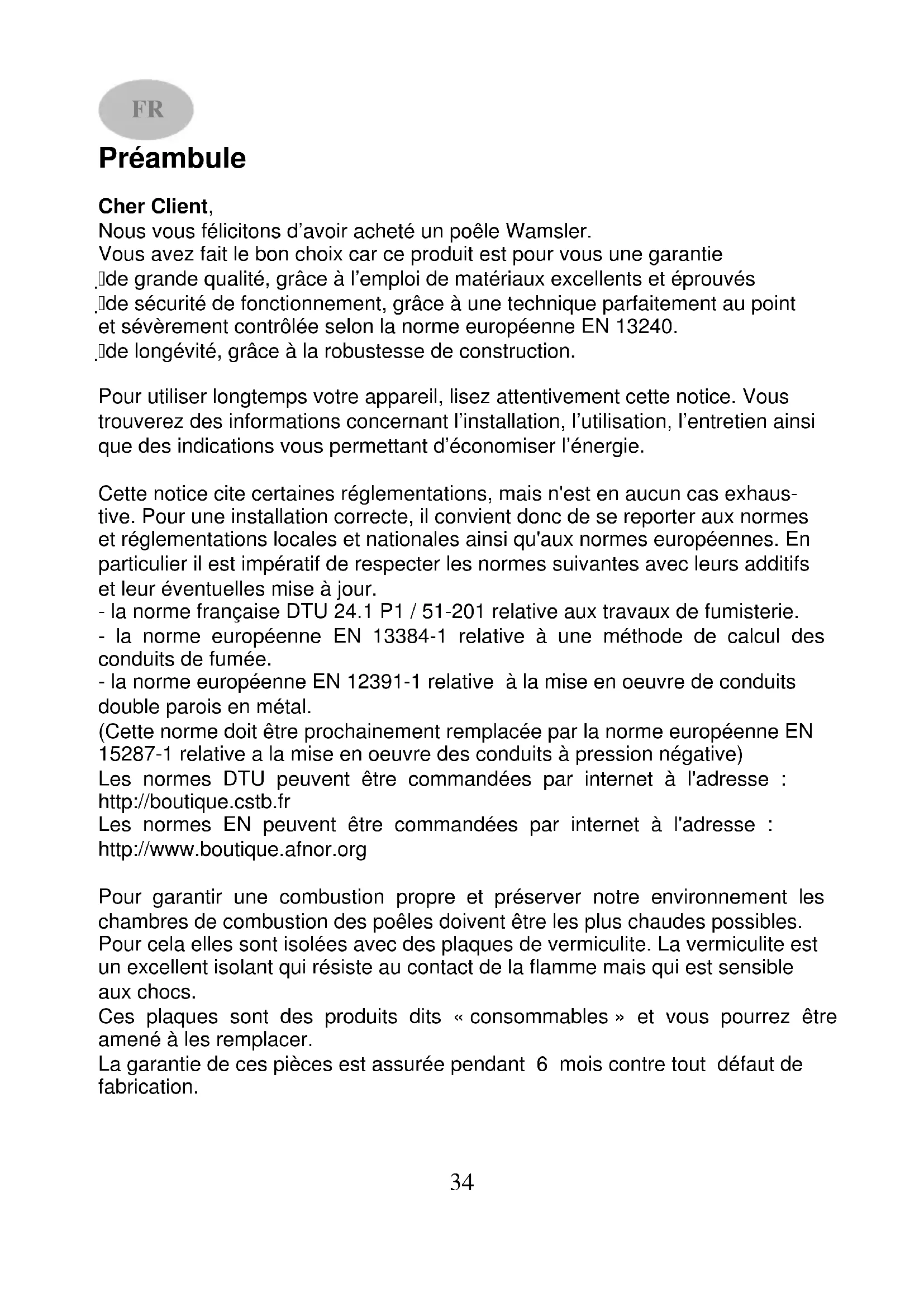 Cher Client, Nous vous félicitons d’avoir acheté un poêle Wamsler. Vous avez fait le bon choix car ce produit est pour vous une garantie de grande qualité, grâce à l’emploi de matériaux excellents et éprouvés de sécurité de fonctionnement, grâce à une technique parfaitement au point et sévèrement contrôlée selon la norme européenne EN 13240. de longévité, grâce à la robustesse de construction. Pour utiliser longtemps votre appareil, lisez attentivement cette notice. Vous trouverez des informations concernant l’installation, l’utilisation, l’entretien ainsi que des indications vous permettant d’économiser l’énergie. Cette notice cite certaines réglementations, mais n'est en aucun cas exhaus- tive. Pour une installation correcte, il convient donc de se reporter aux normes et réglementations locales et nationales ainsi qu'aux normes européennes. En particulier il est impératif de respecter les normes suivantes avec leurs additifs et leur éventuelles mise à jour. - la norme française DTU 24.1 P1 / 51-201 relative aux travaux de fumisterie. - la norme européenne EN 13384-1 relative à une méthode de calcul des conduits de fumée. - la norme européenne EN 12391-1 relative à la mise en oeuvre de conduits double parois en métal. (Cette norme doit être prochainement remplacée par la norme européenne EN 15287-1 relative a la mise en oeuvre des conduits à pression négative) Les normes DTU peuvent être commandées par internet à l'adresse : http://boutique.cstb.fr Les normes EN peuvent être commandées par internet à l'adresse : http://www.boutique.afnor.org Pour garantir une combustion propre et préserver notre environnement les chambres de combustion des poêles doivent être les plus chaudes possibles. Pour cela elles sont isolées avec des plaques de vermiculite. La vermiculite est un excellent isolant qui résiste au contact de la flamme mais qui est sensible aux chocs. Ces plaques sont des produits dits « consommables » et vous pourrez être amené à les remplacer. La garantie de ces pièces est assurée pendant 6 mois contre tout défaut de fabrication.
