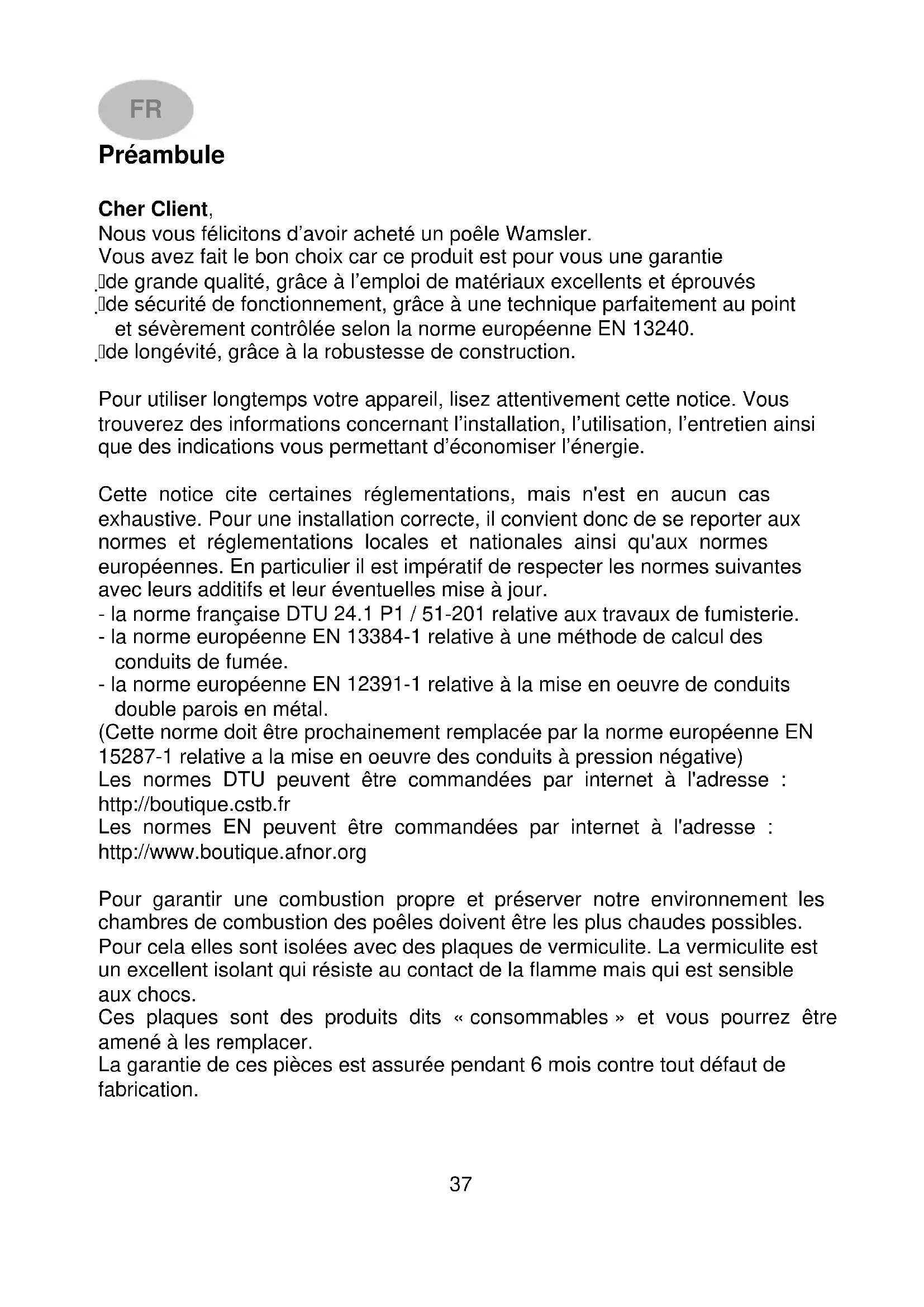 Préambule Cher Client, Nous vous félicitons d’avoir acheté un poêle Wamsler. Vous avez fait le bon choix car ce produit est pour vous une garantie de grande qualité, grâce à l’emploi de matériaux excellents et éprouvés de sécurité de fonctionnement, grâce à une technique parfaitement au point et sévèrement contrôlée selon la norme européenne EN 13240. de longévité, grâce à la robustesse de construction. Pour utiliser longtemps votre appareil, lisez attentivement cette notice. Vous trouverez des informations concernant l’installation, l’utilisation, l’entretien ainsi que des indications vous permettant d’économiser l’énergie. Cette notice cite certaines réglementations, mais n'est en aucun cas exhaustive. Pour une installation correcte, il convient donc de se reporter aux normes et réglementations locales et nationales ainsi qu'aux normes européennes. En particulier il est impératif de respecter les normes suivantes avec leurs additifs et leur éventuelles mise à jour. - la norme française DTU 24.1 P1 / 51-201 relative aux travaux de fumisterie. - la norme européenne EN 13384-1 relative à une méthode de calcul des conduits de fumée. - la norme européenne EN 12391-1 relative à la mise en oeuvre de conduits double parois en métal. (Cette norme doit être prochainement remplacée par la norme européenne EN 15287-1 relative a la mise en oeuvre des conduits à pression négative) Les normes DTU peuvent être commandées par internet à l'adresse : http://boutique.cstb.fr Les normes EN peuvent être commandées par internet à l'adresse : http://www.boutique.afnor.org Pour garantir une combustion propre et préserver notre environnement les chambres de combustion des poêles doivent être les plus chaudes possibles. Pour cela elles sont isolées avec des plaques de vermiculite. La vermiculite est un excellent isolant qui résiste au contact de la flamme mais qui est sensible aux chocs. Ces plaques sont des produits dits « consommables » et vous pourrez être amené à les remplacer. La garantie de ces pièces est assurée pendant 6 mois contre tout défaut de fabrication.