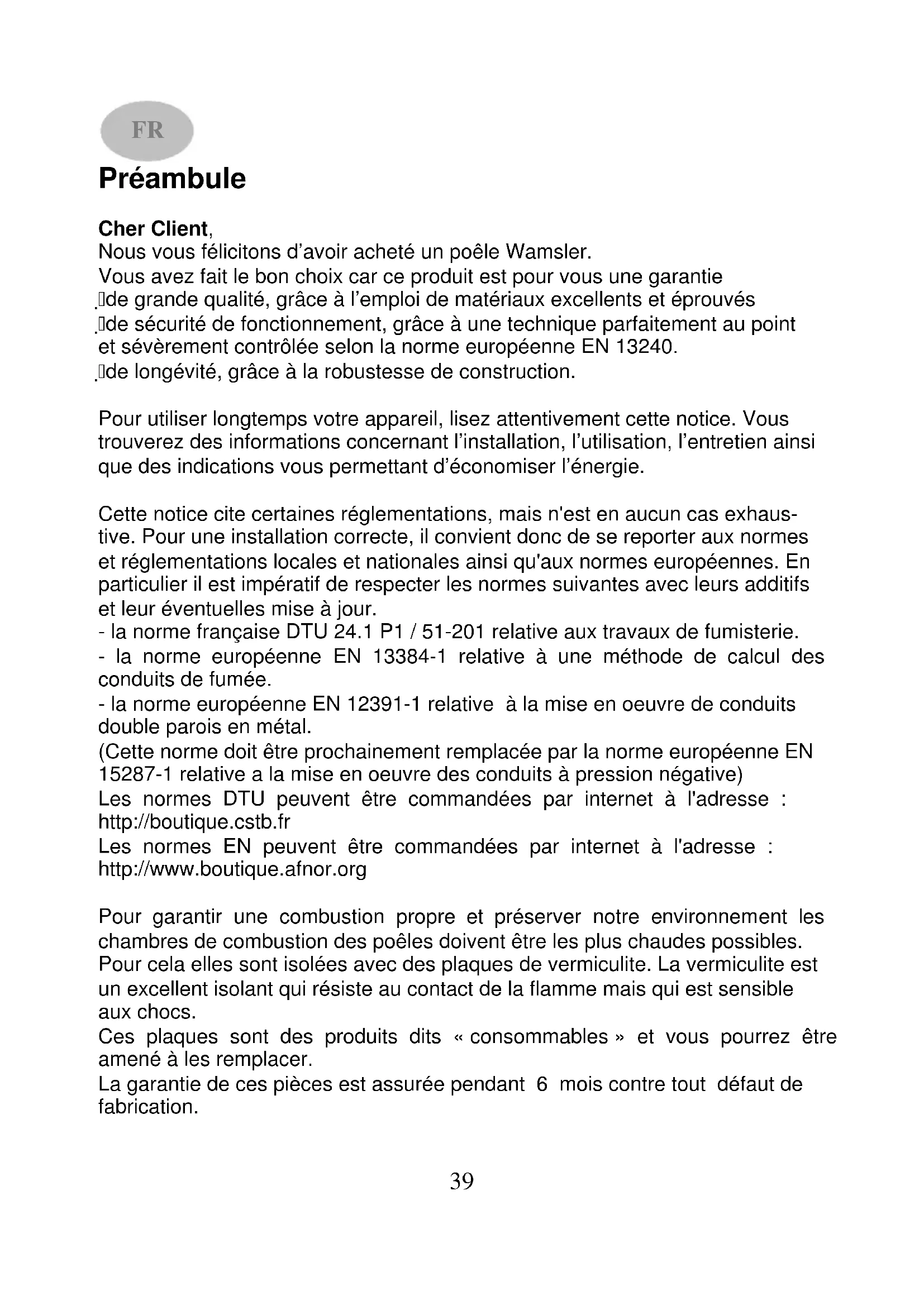 Cher Client, Nous vous félicitons d’avoir acheté un poêle Wamsler. Vous avez fait le bon choix car ce produit est pour vous une garantie de grande qualité, grâce à l’emploi de matériaux excellents et éprouvés de sécurité de fonctionnement, grâce à une technique parfaitement au point et sévèrement contrôlée selon la norme européenne EN 13240. de longévité, grâce à la robustesse de construction. Pour utiliser longtemps votre appareil, lisez attentivement cette notice. Vous trouverez des informations concernant l’installation, l’utilisation, l’entretien ainsi que des indications vous permettant d’économiser l’énergie. Cette notice cite certaines réglementations, mais n'est en aucun cas exhaus- tive. Pour une installation correcte, il convient donc de se reporter aux normes et réglementations locales et nationales ainsi qu'aux normes européennes. En particulier il est impératif de respecter les normes suivantes avec leurs additifs et leur éventuelles mise à jour. - la norme française DTU 24.1 P1 / 51-201 relative aux travaux de fumisterie. - la norme européenne EN 13384-1 relative à une méthode de calcul des conduits de fumée. - la norme européenne EN 12391-1 relative à la mise en oeuvre de conduits double parois en métal. (Cette norme doit être prochainement remplacée par la norme européenne EN 15287-1 relative a la mise en oeuvre des conduits à pression négative) Les normes DTU peuvent être commandées par internet à l'adresse : http://boutique.cstb.fr Les normes EN peuvent être commandées par internet à l'adresse : http://www.boutique.afnor.org Pour garantir une combustion propre et préserver notre environnement les chambres de combustion des poêles doivent être les plus chaudes possibles. Pour cela elles sont isolées avec des plaques de vermiculite. La vermiculite est un excellent isolant qui résiste au contact de la flamme mais qui est sensible aux chocs. Ces plaques sont des produits dits « consommables » et vous pourrez être amené à les remplacer. La garantie de ces pièces est assurée pendant 6 mois contre tout défaut de fabrication. FR40 Pour les préserver il faut veiller à respecter les quantités maximum de bois (indiquées dans cette notice) et éviter les chocs lors de l'introduction des bû- ches. Ainsi vous pourrez profiter de votre poêle plusieurs saisons sans les remplacer. La pierre ollaire est un produit naturel avec des nuances de couleur et des veines, en aucun cas l'aspect de la pierre est un motif de réclamation. Attention Pour toute commande de pièces de rechange indiquer le № de type, le № de référence et le № de série inscrits sur la plaque signalétique de l’appareil.