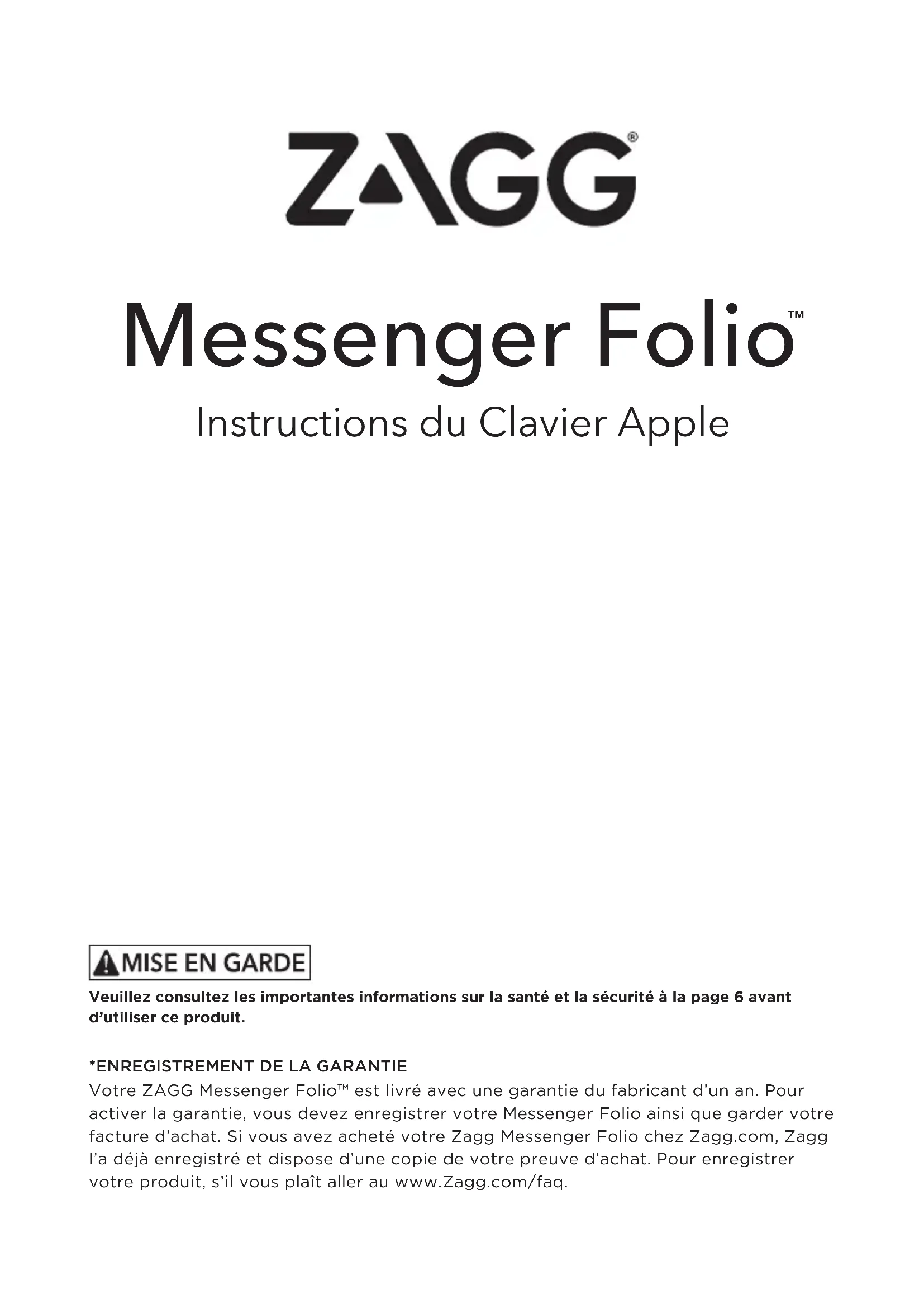 Votre ZAGG Messenger Folio™ est livré avec une garantie du fabricant d'un an. Pour activer la garantie, vous doivent enregistrer votre Messenger Folio ainsi que garder votre facture d'achat. Si vous avons achété votre Zagg Messenger Folio chez Zagg.com, Zagg l'a déjà enregistré et dispose d'une copie de votre preuve d'achat. Pour enregistrer votre produit, s'il vous plaît aller au www.Zagg.com/faq.