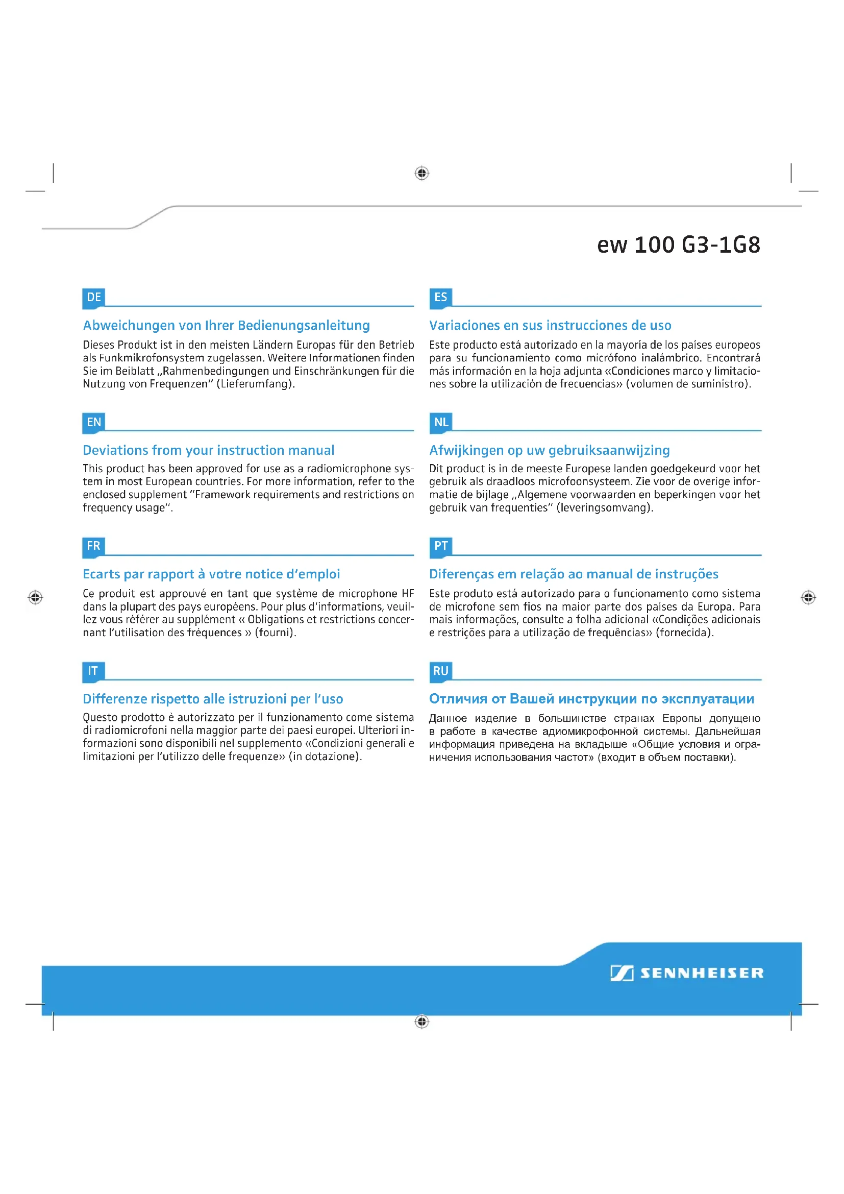 ew 100 G3-1G8FR Ecarts par rapport à votre notice d‘emploi Le système de banques de fréquences (EM, SK, SKM) Les émetteurs et les récepteurs sont disponibles dans la plage de fréquences suivante : Plage de fréquences Largeur de bande Incréments Fréquences 1785–1800 MHz 15 MHz 10 kHz 1500 Des informations divergentes, p. ex. dans le chapitre « Caractéris- tiques techniques » de votre notice d‘emploi, sont remplacées par les valeurs mentionnées ici. Caractéristiques techniques modifiées (SK, SKM) Stabilité de fréquence Puissance de sortie HF à 50 Ω ±30 ppm typ. 10 mW Antennes modifiées (EM) La construction des antennes diffère de l‘illustration indiquée dans la notice d‘emploi : 왘 Utilisez les antennes fournies. Elles sont mar- quées de l‘impression « 1G8 » et s‘amincissent vers le haut (voir l‘illustration à droite). 왘 Raccordez les antennes comme décrit dans la notice d‘emploi. Vous pouvez également utiliser les anten- nes déportées directionnelles AD 1800 (à commander séparément).