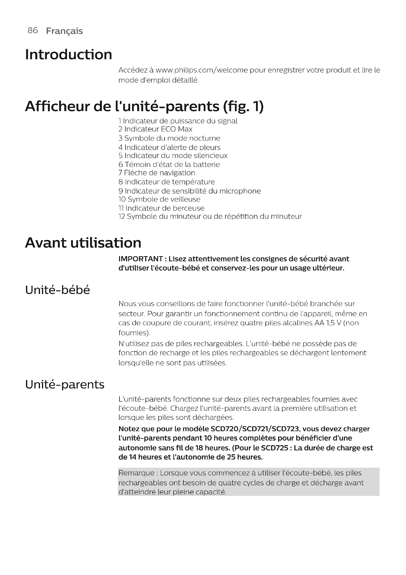 Notez que pour le modele SCD720/SCD721/SCD723, vous devez charger l'unité-parents pendant 10 heures complètes pour bénéficier d'une autonomie sans fil de 18 heures. (Pour le SCD725 : La durée de charge est de 14 heures et l'autonomie de 25 heures.