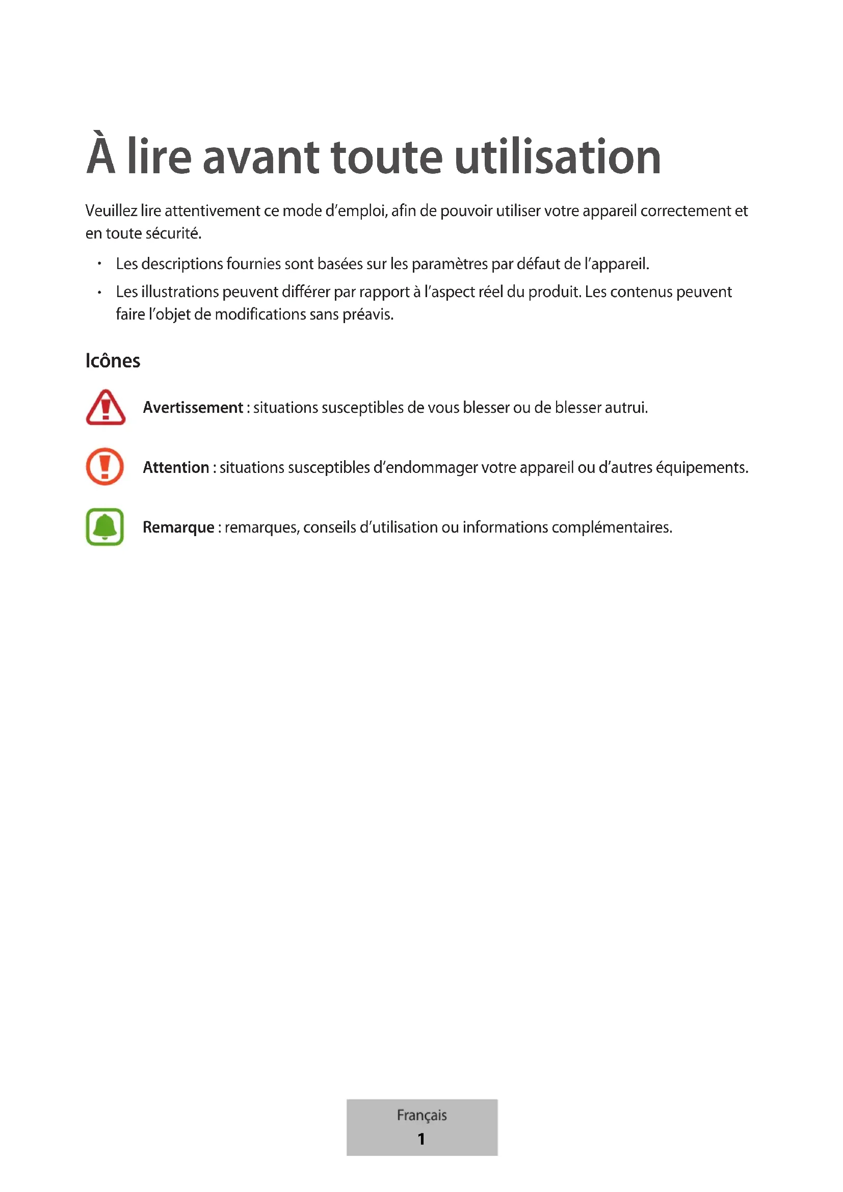 Attention : situations susceptibles d’endommager votre appareil ou d’autres équipements. Remarque : remarques, conseils d’utilisation ou informations complémentaires. Français