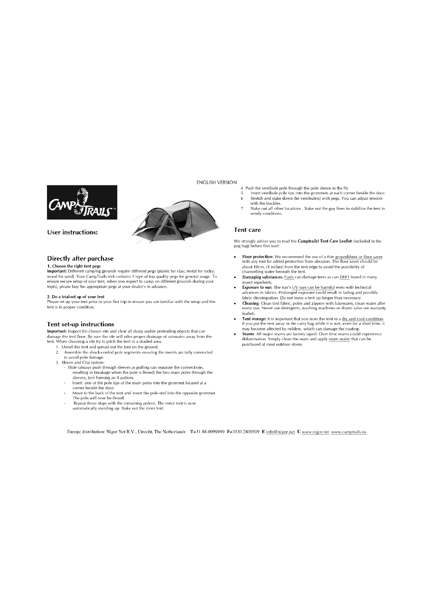 Veuillez fire tres attentivement la notice de garantie et d'entretien de la tente (inclus dans le sac à sardines) avant la première utilisation