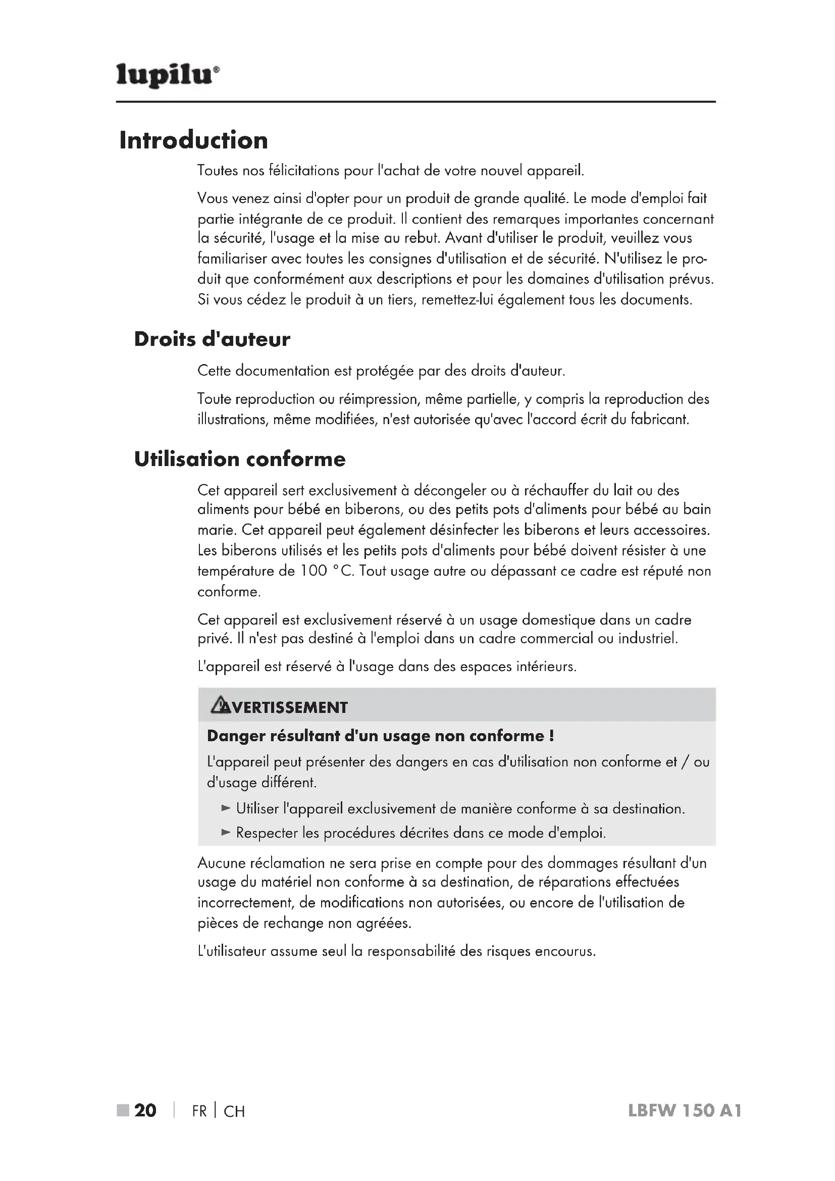 LBFW 150 A1 Introduction Toutes nos félicitations pour l'achat de votre nouvel appareil. Vous venez ainsi d'opter pour un produit de grande qualité. Le mode d'emploi fait partie intégrante de ce produit. Il contient des remarques importantes concernant la sécurité, l'usage et la mise au rebut. Avant d'utiliser le produit, veuillez vous familiariser avec toutes les consignes d'utilisation et de sécurité. N'utilisez le pro- duit que conformément aux descriptions et pour les domaines d'utilisation prévus. Si vous cédez le produit à un tiers, remettez-lui également tous les documents. Droits d'auteur Cette documentation est protégée par des droits d'auteur. Toute reproduction ou réimpression, même partielle, y compris la reproduction des illustrations, même modifiées, n'est autorisée qu'avec l'accord écrit du fabricant. Utilisation conforme Cet appareil sert exclusivement à décongeler ou à réchauffer du lait ou des aliments pour bébé en biberons, ou des petits pots d'aliments pour bébé au bain marie. Cet appareil peut également désinfecter les biberons et leurs accessoires. Les biberons utilisés et les petits pots d'aliments pour bébé doivent résister à une température de 100°C. Tout usage autre ou dépassant ce cadre est réputé non conforme. Cet appareil est exclusivement réservé à un usage domestique dans un cadre privé. Il n'est pas destiné à l'emploi dans un cadre commercial ou industriel. L'appareil est réservé à l'usage dans des espaces intérieurs. AVERTISSEMENT Danger résultant d'un usage non conforme! L'appareil peut présenter des dangers en cas d'utilisation non conforme et / ou d'usage différent. ► Utiliser l'appareil exclusivement de manière conforme à sa destination. ► Respecter les procédures décrites dans ce mode d'emploi. Aucune réclamation ne sera prise en compte pour des dommages résultant d'un usage du matériel non conforme à sa destination, de réparations effectuées incorrectement, de modifications non autorisées, ou encore de l'utilisation de pièces de rechange non agréées. L'utilisateur assume seul la responsabilité des risques encourus.FR
