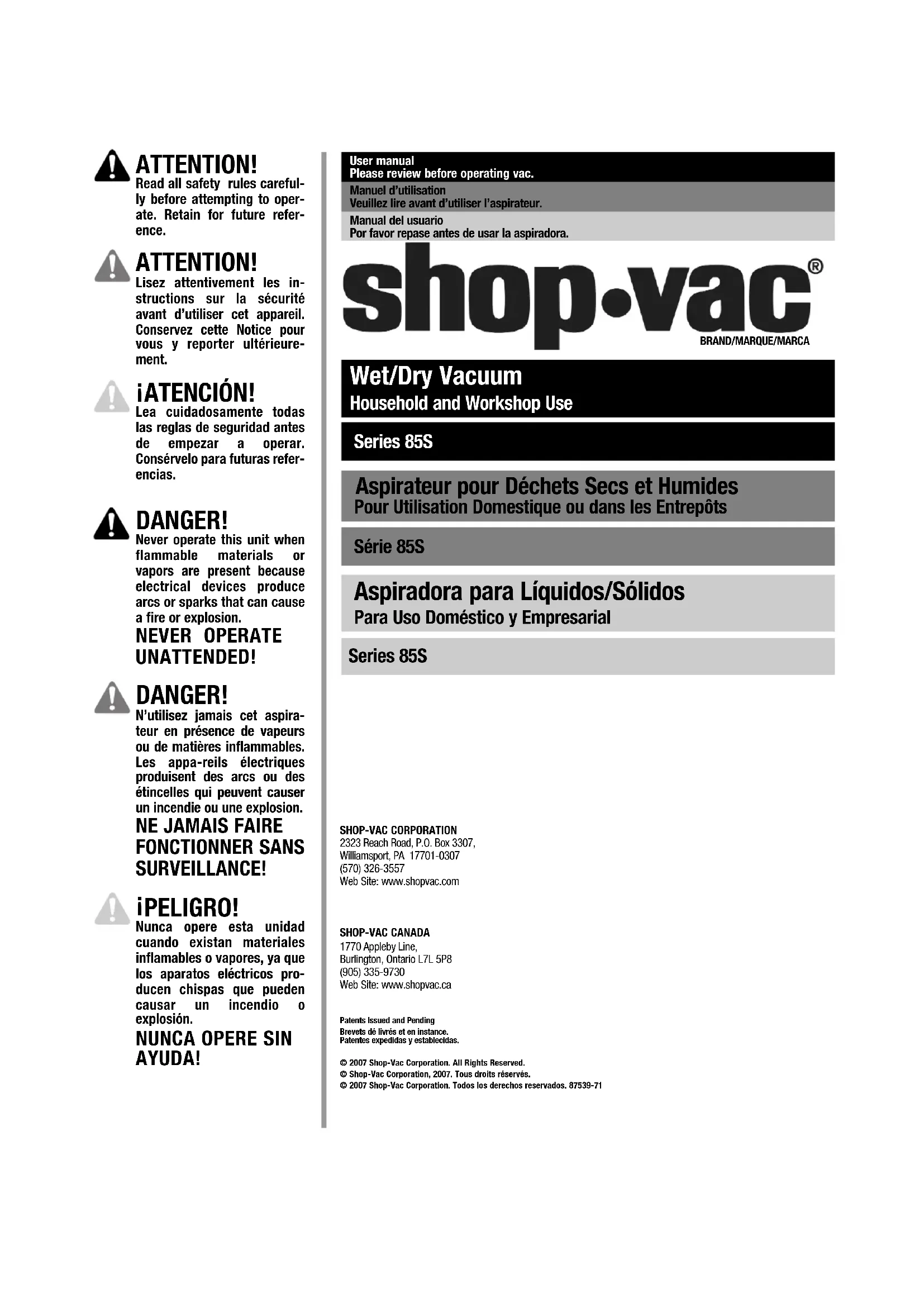 Retrouvez gratuitement la notice de l'appareil 85S200 Shop-Vac au format PDF.