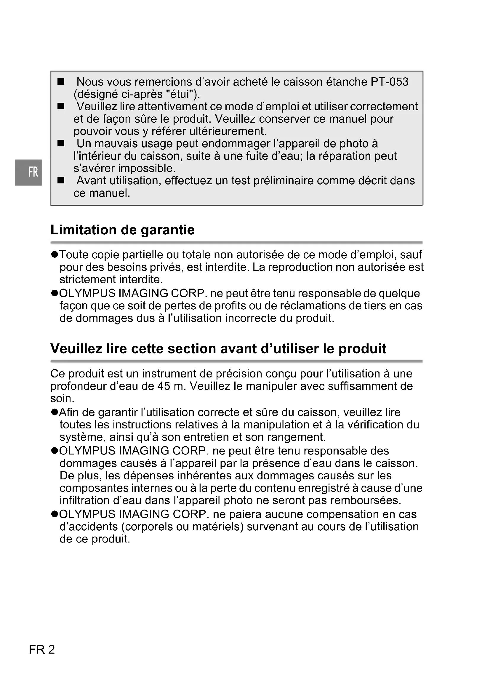 Limitation de garantie zToute copie partielle ou totale non autorisée de ce mode d’emploi, sauf pour des besoins privés, est interdite. La reproduction non autorisée est strictement interdite. zOLYMPUS IMAGING CORP. ne peut être tenu responsable de quelque façon que ce soit de pertes de profits ou de réclamations de tiers en cas de dommages dus à l’utilisation incorrecte du produit. Veuillez lire cette section avant d’utiliser le produit Ce produit est un instrument de précision conçu pour l’utilisation à une profondeur d’eau de 45 m. Veuillez le manipuler avec suffisamment de soin. zAfin de garantir l’utilisation correcte et sûre du caisson, veuillez lire toutes les instructions relatives à la manipulation et à la vérification du système, ainsi qu’à son entretien et son rangement. zOLYMPUS IMAGING CORP. ne peut être tenu responsable des dommages causés à l’appareil par la présence d’eau dans le caisson. De plus, les dépenses inhérentes aux dommages causés sur les composantes internes ou à la perte du contenu enregistré à cause d’une infiltration d’eau dans l’appareil photo ne seront pas remboursées. zOLYMPUS IMAGING CORP. ne paiera aucune compensation en cas d’accidents (corporels ou matériels) survenant au cours de l’utilisation de ce produit. Nous vous remercions d’avoir acheté le caisson étanche PT-053 (désigné ci-après "étui"). Veuillez lire attentivement ce mode d’emploi et utiliser correctement et de façon sûre le produit. Veuillez conserver ce manuel pour pouvoir vous y référer ultérieurement. Un mauvais usage peut endommager l’appareil de photo à l’intérieur du caisson, suite à une fuite d’eau; la réparation peut s’avérer impossible. Avant utilisation, effectuez un test préliminaire comme décrit dans ce manuel. PT-053_FR.book Page 2 Monday, March 26, 2012 5:48 PMFR 3