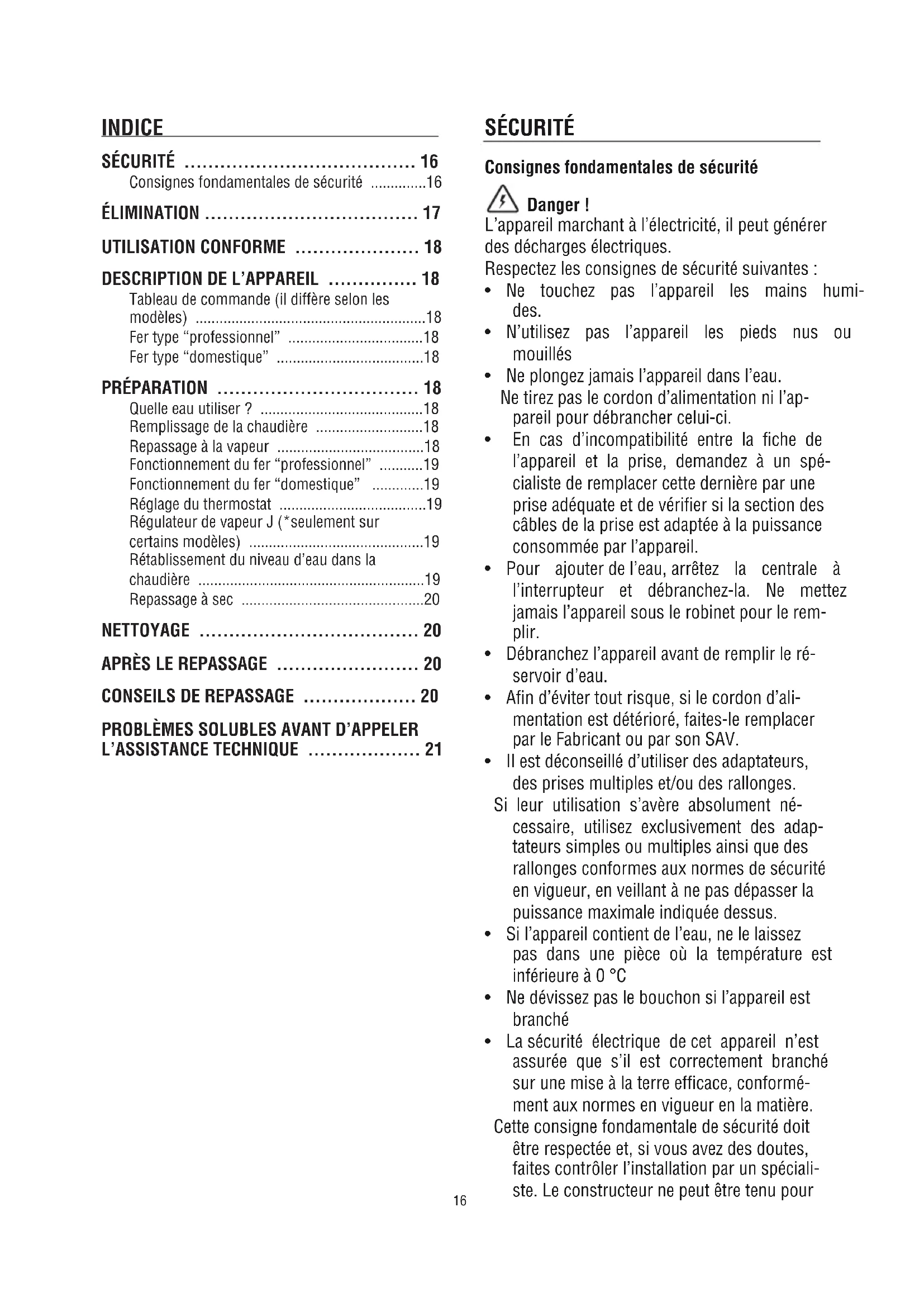 - La sécurité électrique de cet appareil n’est assurée que s’il est correctement branché sur une mise à la terre efficace, conformé- ment aux normes en vigueur en la matière. Cette consigne fondamentale de sécurité doit êtrerespectéeet,sivousavezdesdoutes, faites contrôler l’installation par un spéciali- ste.Leconstructeurnepeutêtretenupour INDICE SÉCURITÉ ....................................... 16 Consignes fondamentales de sécurité ..............16 ÉLIMINATION .................................... 17 UTILISATION CONFORME ..................... 18
