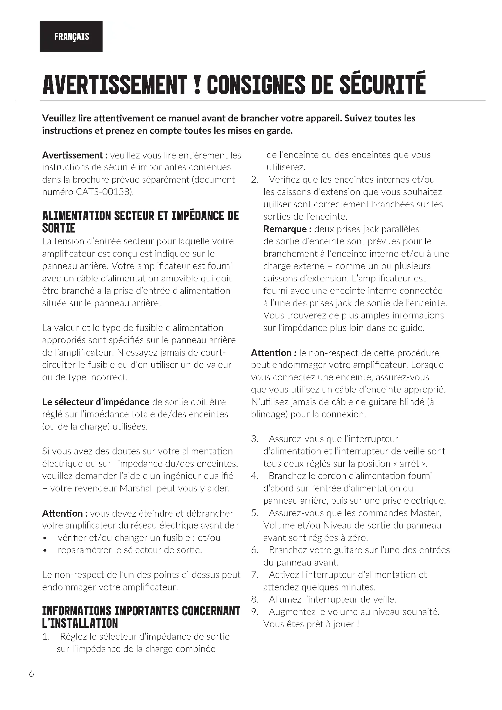 SORTIE Latensiond’entréesecteurpourlaquellevotre amplicateurestconçuestindiquéesurle panneauarrière.Votreamplicateurestfourni avecuncâbled’alimentaonamoviblequidoit êtrebranchéàlaprised’entréed’alimentaon situéesurlepanneauarrière. Lavaleuretletypedefusibled’alimentaon appropriéssontspéciéssurlepanneauarrière del’amplicateur.N’essayezjamaisdecourt- circuiterlefusibleoud’enuliserundevaleur oudetypeincorrect. Le sélecteur d’impédancedesoredoitêtre réglésurl’impédancetotalede/desenceintes (oudelacharge)ulisées. Sivousavezdesdoutessurvotrealimentaon électriqueousurl’impédancedu/desenceintes, veuillezdemanderl’aided’uningénieurqualié –votrerevendeurMarshallpeutvousyaider. Aenon : vousdevezéteindreetdébrancher votreamplicateurduréseauélectriqueavantde:
