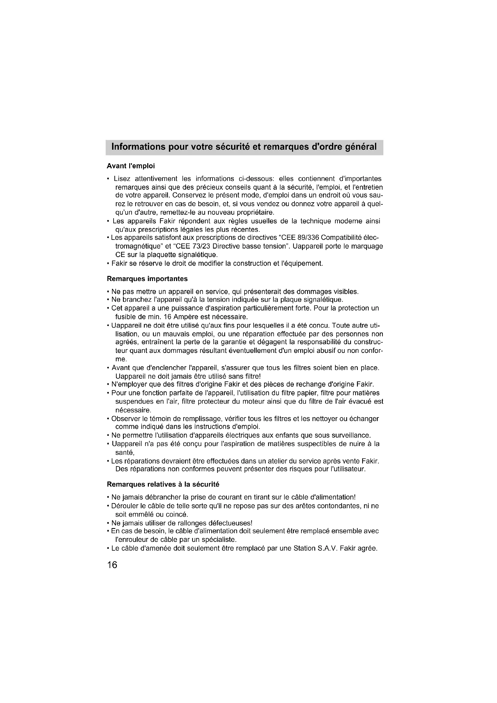 - Le câble d'amenée doit seulement être remplacé par une Station S.A.V. Fakir agrée.Informations pour votre sécurité et remarques d'ordre général
