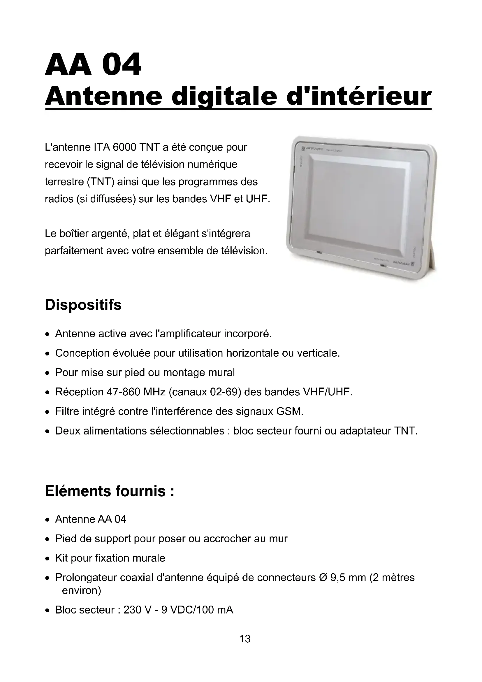 - Bloc secteur : 230 V - 9 VDC/100 mA 13Antenne AA 04 Pied de support Kit pour fixation Prolongateur coaxial Bloc murale secteur Notes sur l'emplacement et l'installation :