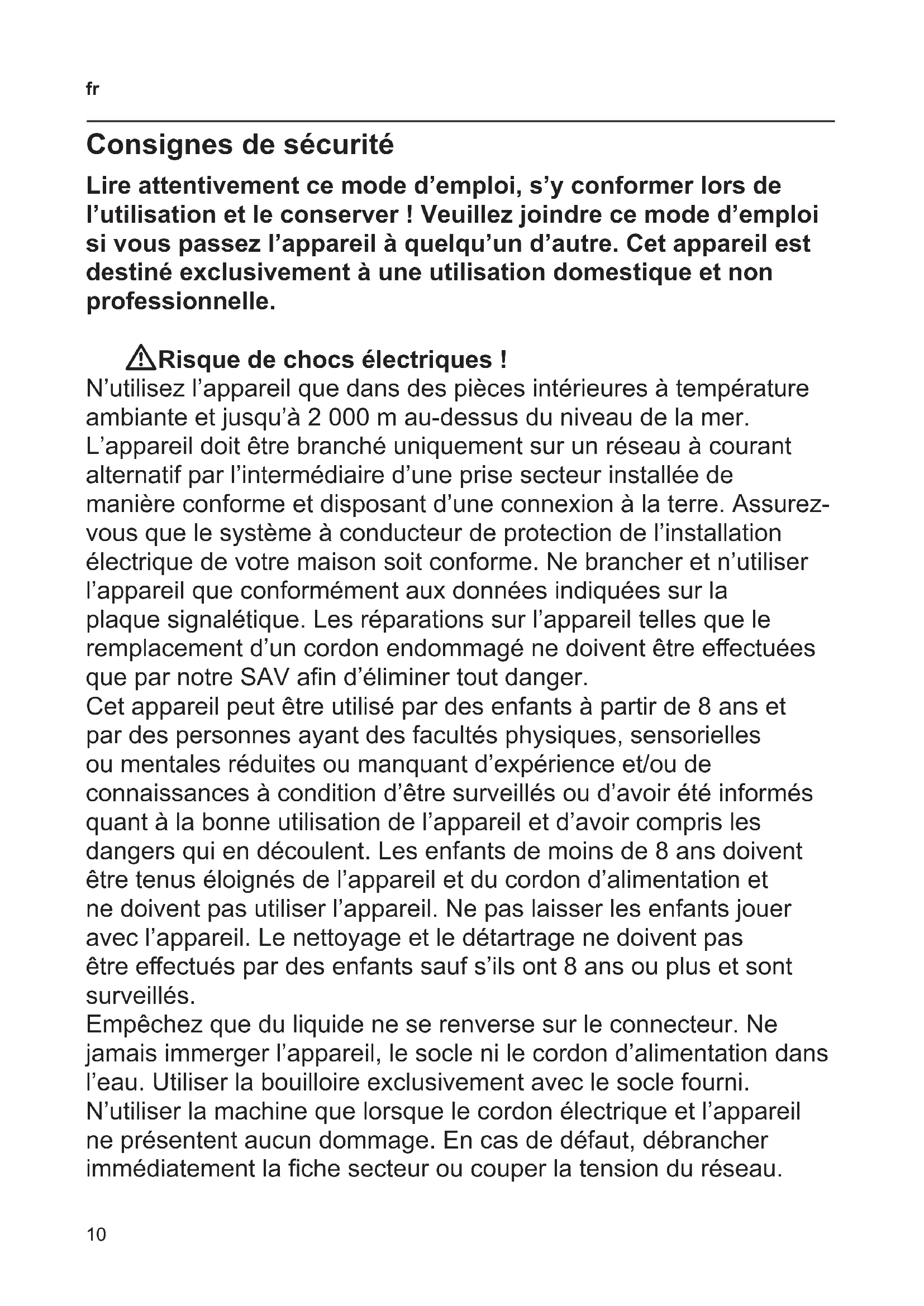 Consignes de sécurité Lire attentivement ce mode d’emploi, s’y conformer lors de l’utilisation et le conserver ! Veuillez joindre ce mode d’emploi si vous passez l’appareil à quelqu’un d’autre. Cet appareil est destiné exclusivement à une utilisation domestique et non professionnelle. WRisque de chocs électriques ! N’utilisez l’appareil que dans des pièces intérieures à température ambiante et jusqu’à 2 000 m au-dessus du niveau de la mer. L’appareil doit être branché uniquement sur un réseau à courant alternatif par l’intermédiaire d’une prise secteur installée de manière conforme et disposant d’une connexion à la terre. Assurez- vous que le système à conducteur de protection de l’installation électrique de votre maison soit conforme. Ne brancher et n’utiliser l’appareil que conformément aux données indiquées sur la plaque signalétique. Les réparations sur l’appareil telles que le remplacement d’un cordon endommagé ne doivent être eectuées que par notre SAV an d’éliminer tout danger. Cet appareil peut être utilisé par des enfants à partir de 8 ans et par des personnes ayant des facultés physiques, sensorielles ou mentales réduites ou manquant d’expérience et/ou de connaissances à condition d’être surveillés ou d’avoir été informés quant à la bonne utilisation de l’appareil et d’avoir compris les dangers qui en découlent. Les enfants de moins de 8 ans doivent être tenus éloignés de l’appareil et du cordon d’alimentation et ne doivent pas utiliser l’appareil. Ne pas laisser les enfants jouer avec l’appareil. Le nettoyage et le détartrage ne doivent pas être eectués par des enfants sauf s’ils ont 8 ans ou plus et sont surveillés. Empêchez que du liquide ne se renverse sur le connecteur. Ne jamais immerger l’appareil, le socle ni le cordon d’alimentation dans l’eau. Utiliser la bouilloire exclusivement avec le socle fourni. N’utiliser la machine que lorsque le cordon électrique et l’appareil ne présentent aucun dommage. En cas de défaut, débrancher immédiatement la che secteur ou couper la tension du réseau.11