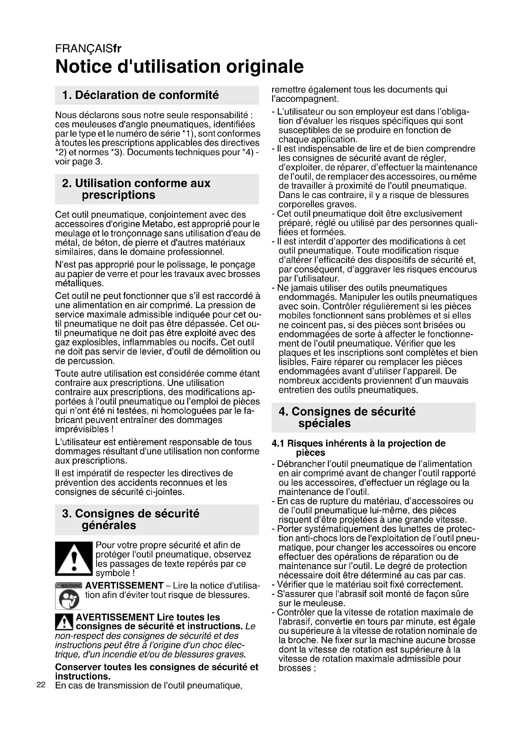 Notice d'utilisation originale Nous déclarons sous notre seule responsabilité : ces meuleuses d'angle pneumatiques, identifiées par le type et le numéro de série *1), sont conformes à toutes les prescriptions applicables des directives *2) et normes *3). Documents techniques pour *4) - voir page 3. Cet outil pneumatique, conjointement avec des accessoires d'origine Metabo, est approprié pour le meulage et le tronçonnage sans utilisation d'eau de métal, de béton, de pierre et d'autres matériaux similaires, dans le domaine professionnel. N'est pas approprié pour le polissage, le ponçage au papier de verre et pour les travaux avec brosses métalliques. Cet outil ne peut fonctionner que s’il est raccordé à une alimentation en air comprimé. La pression de service maximale admissible indiquée pour cet ou- til pneumatique ne doit pas être dépassée. Cet ou- til pneumatique ne doit pas être exploité avec des gaz explosibles, inflammables ou nocifs. Cet outil ne doit pas servir de levier, d’outil de démolition ou de percussion. Toute autre utilisation est considérée comme étant contraire aux prescriptions. Une utilisation contraire aux prescriptions, des modifications ap- portées à l’outil pneumatique ou l’emploi de pièces qui n’ont été ni testées, ni homologuées par le fa- bricant peuvent entraîner des dommages imprévisibles ! L'utilisateur est entièrement responsable de tous dommages résultant d'une utilisation non conforme aux prescriptions. Il est impératif de respecter les directives de prévention des accidents reconnues et les consignes de sécurité ci-jointes. Pour votre propre sécurité et afin de protéger l'outil pneumatique, observez les passages de texte repérés par ce symbole ! AVERTISSEMENT – Lire la notice d'utilisa- tion afin d'éviter tout risque de blessures. AVERTISSEMENT Lire toutes les consignes de sécurité et instructions. Le non-respect des consignes de sécurité et des instructions peut être à l'origine d'un choc élec- trique, d'un incendie et/ou de blessures graves. Conserver toutes les consignes de sécurité et instructions. En cas de transmission de l’outil pneumatique, remettre également tous les documents qui l’accompagnent. - L’utilisateur ou son employeur est dans l’obliga- tion d’évaluer les risques spécifiques qui sont susceptibles de se produire en fonction de chaque application. - Il est indispensable de lire et de bien comprendre les consignes de sécurité avant de régler, d'exploiter, de réparer, d’effectuer la maintenance de l’outil, de remplacer des accessoires, ou même de travailler à proximité de l’outil pneumatique. Dans le cas contraire, il y a risque de blessures corporelles graves. - Cet outil pneumatique doit être exclusivement préparé, réglé ou utilisé par des personnes quali- fiées et formées. - Il est interdit d’apporter des modifications à cet outil pneumatique. Toute modification risque d’altérer l’efficacité des dispositifs de sécurité et, par conséquent, d’aggraver les risques encourus par l’utilisateur. - Ne jamais utiliser des outils pneumatiques endommagés. Manipuler les outils pneumatiques avec soin. Contrôler régulièrement si les pièces mobiles fonctionnent sans problèmes et si elles ne coincent pas, si des pièces sont brisées ou endommagées de sorte à affecter le fonctionne- ment de l’outil pneumatique. Vérifier que les plaques et les inscriptions sont complètes et bien lisibles. Faire réparer ou remplacer les pièces endommagées avant d’utiliser l’appareil. De nombreux accidents proviennent d’un mauvais entretien des outils pneumatiques.