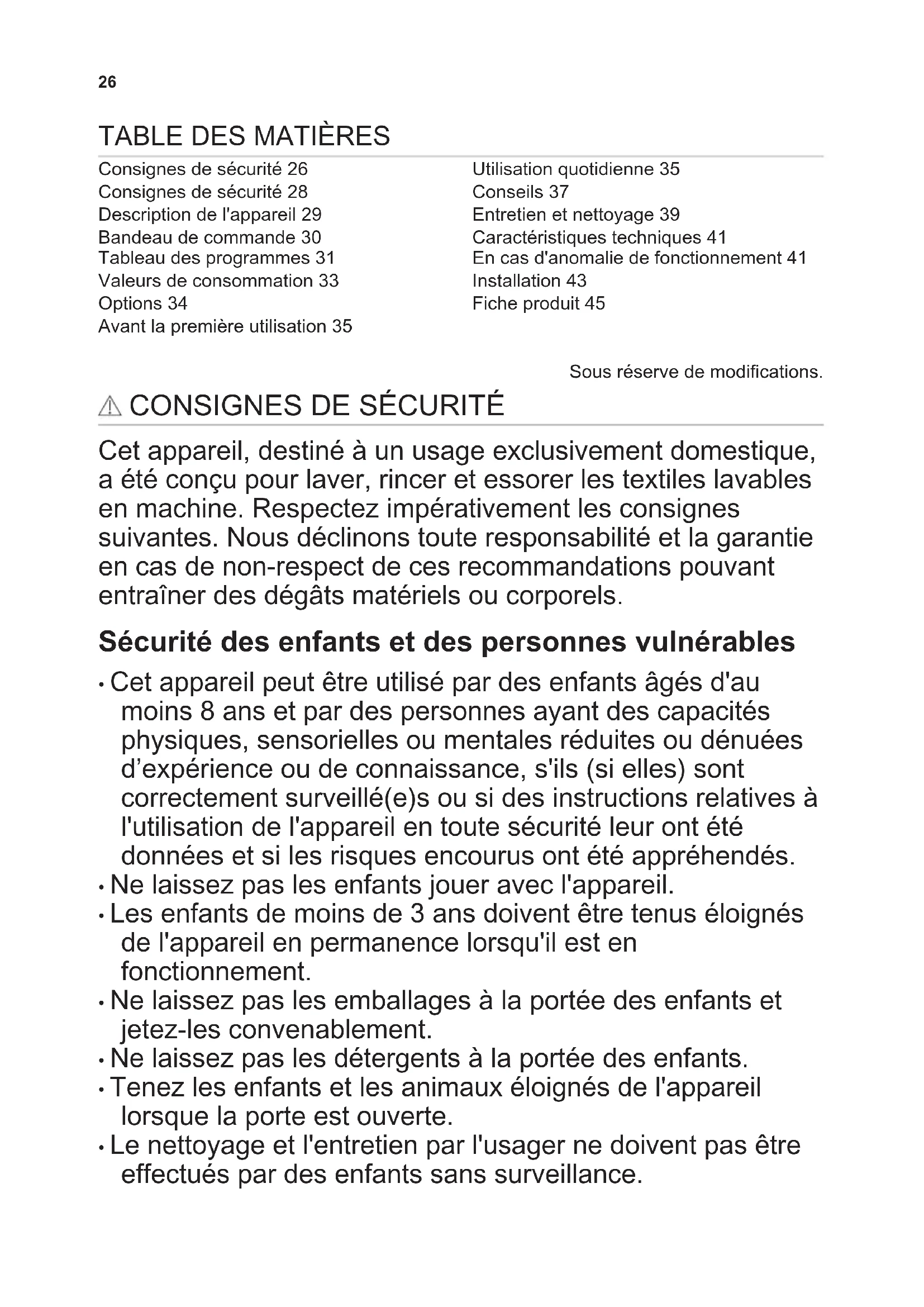 Consignes de sécurité 26 Consignes de sécurité 28 Description de l'appareil 29 Bandeau de commande 30 Tableau des programmes 31 Valeurs de consommation 33 Options 34 Avant la première utilisation 35 Utilisation quotidienne 35 Conseils 37 Entretien et nettoyage 39 Caractéristiques techniques 41 En cas d'anomalie de fonctionnement 41 Installation 43 Fiche produit 45 Sous réserve de modifications.