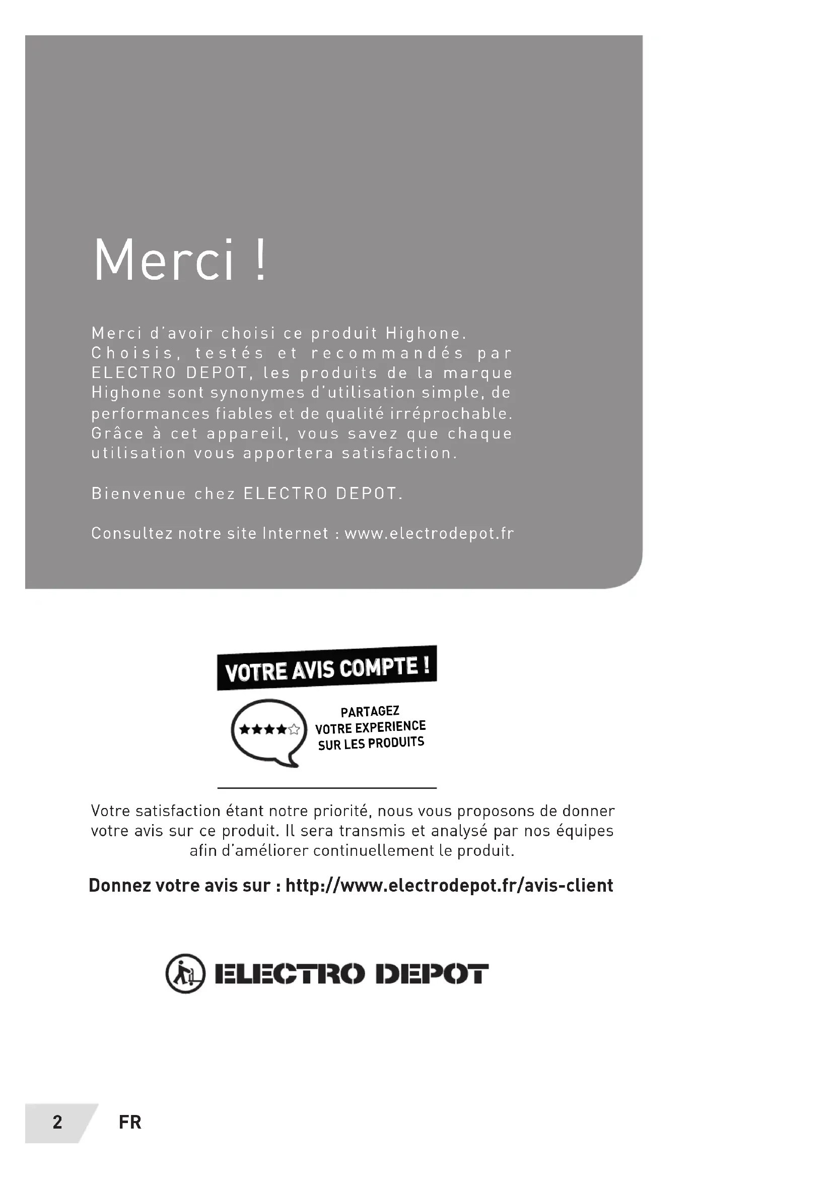 Votre satisfaction étant notre priorité, nous vous proposons de donner votre avis sur ce produit. Il sera transmis et analysé par nos équipes afin d’améliorer continuellement le produit. Donnez votre avis sur: http://www.electrodepot.fr/avis-clientFR 3 Français