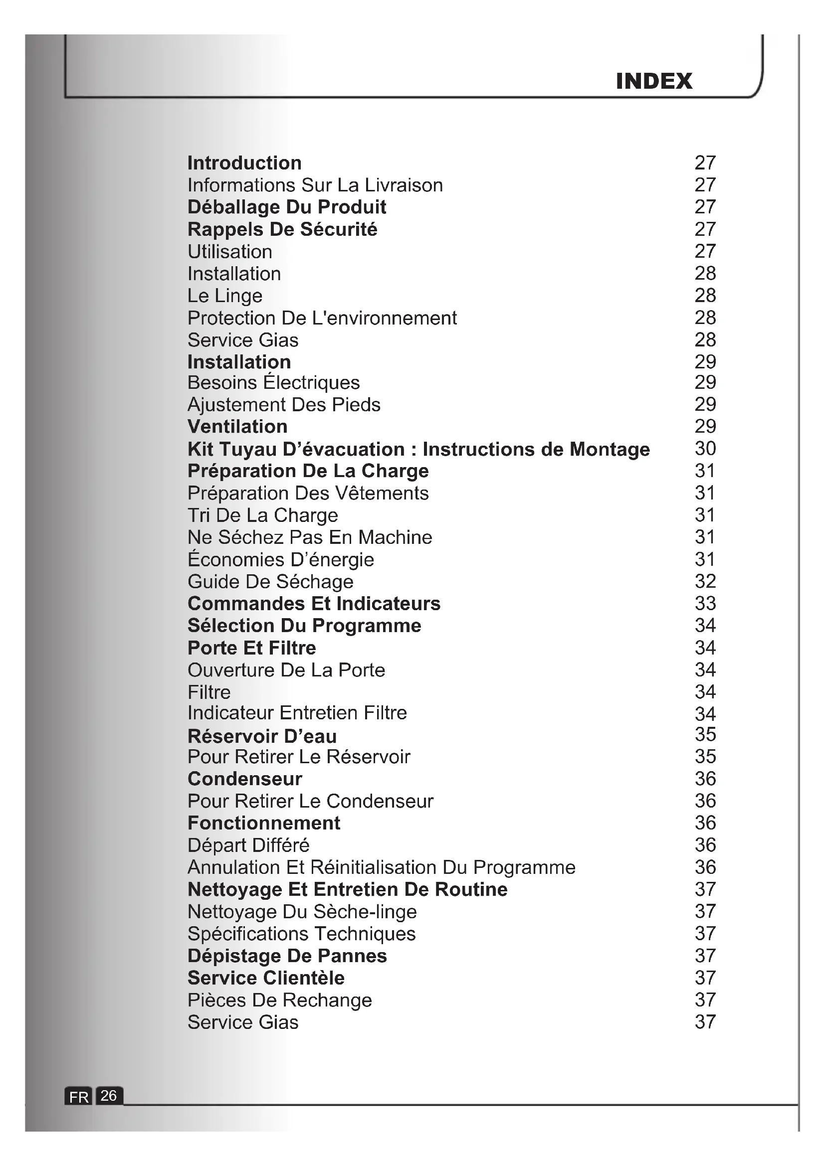 Introduction Informations Sur La Livraison Déballage Du Produit Rappels De Sécurité Utilisation Installation Le Linge Protection De L'environnement Service Gias Installation Besoins Électriques Ajustement Des Pieds Ventilation Kit Tuyau D’évacuation : Instructions de Montage Préparation De La Charge Préparation Des Vêtements Tri De La Charge Ne Séchez Pas En Machine Économies D’énergie Guide De Séchage Commandes Et Indicateurs Sélection Du Programme Porte Et Filtre Ouverture De La Porte Filtre Indicateur Entretien Filtre Réservoir D’eau Pour Retirer Le Réservoir Condenseur Pour Retirer Le Condenseur Fonctionnement Départ Différé Annulation Et Réinitialisation Du Programme Nettoyage Et Entretien De Routine Nettoyage Du Sèche-linge Spécifications Techniques Dépistage De Pannes Service Clientèle Pièces De Rechange Service Gias INDEX