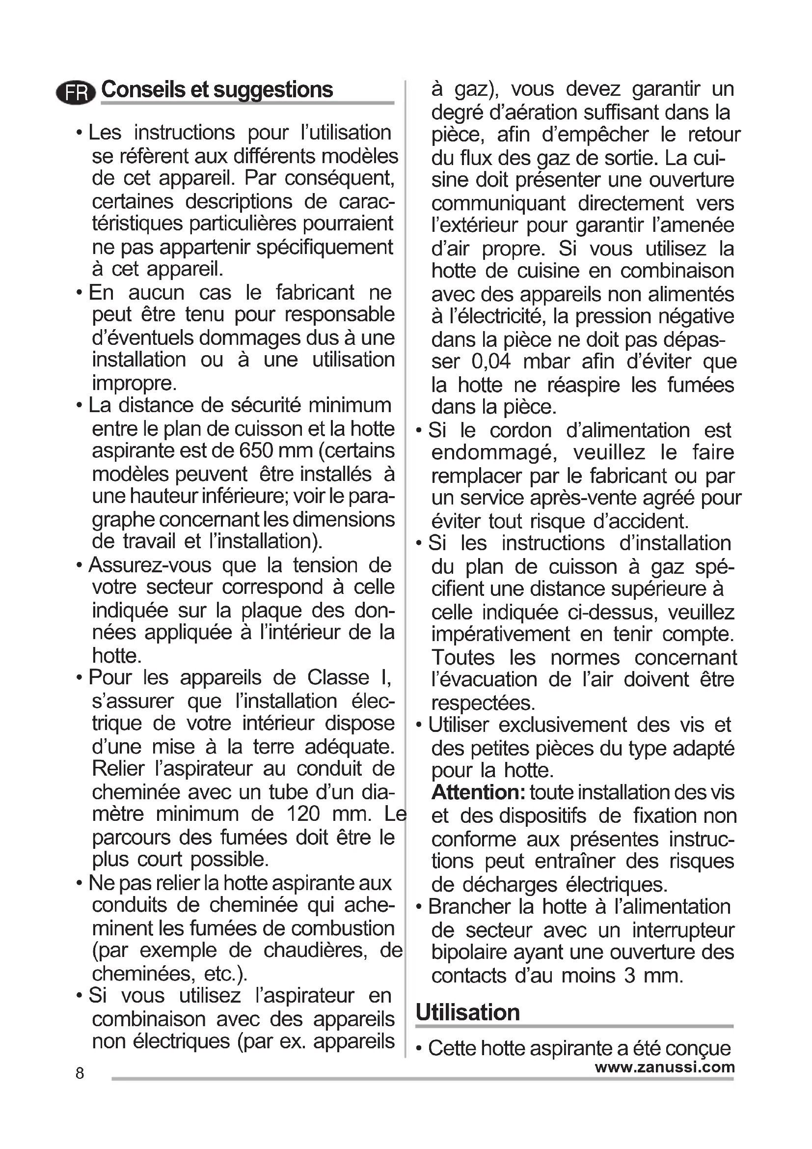 - Cette hotte aspirante a été conçue FR9 www.zanussi.com exclusivement pour un usage domestique, dans le but d’éliminer les odeurs de cuisine.