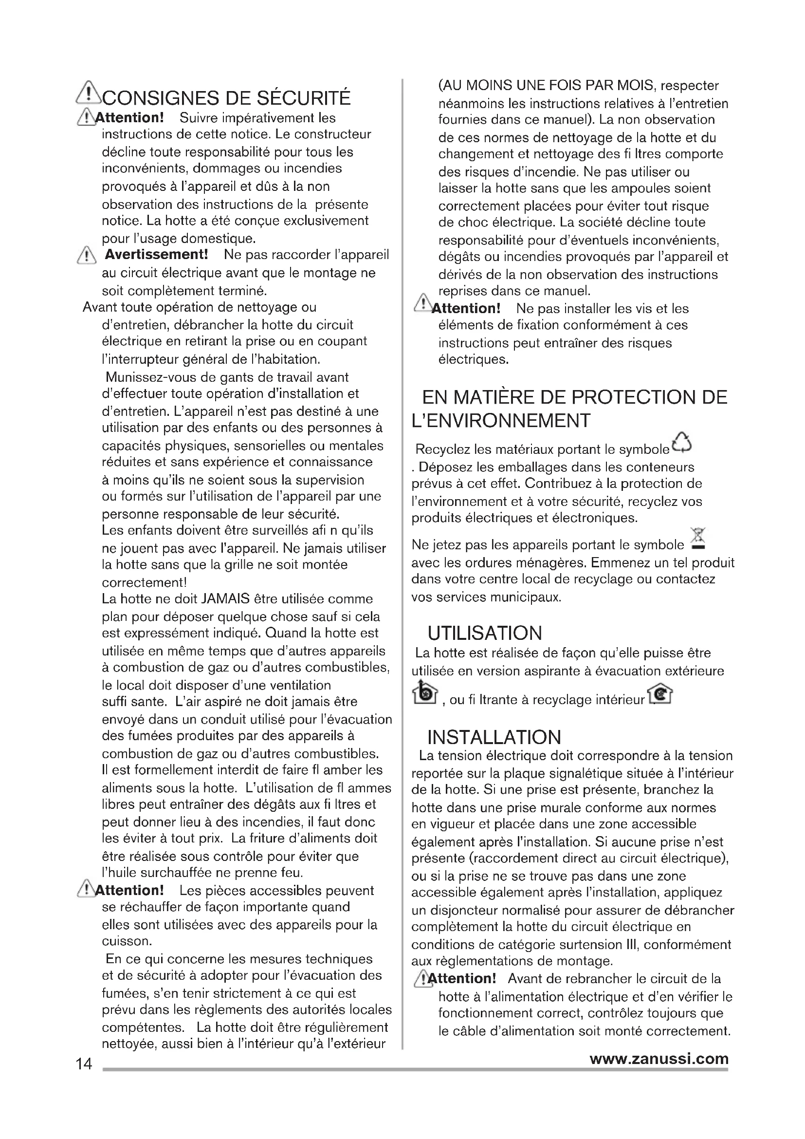 L’ENVIRONNEMENT Recyclez les matériaux portant le symbole . Déposez les emballages dans les conteneurs prévus à cet effet. Contribuez à la protection de l’environnement et à votre sécurité, recyclez vos produits électriques et électroniques. Ne jetez pas les appareils portant le symbole avec les ordures ménagères. Emmenez un tel produit dans votre centre local de recyclage ou contactez vos services municipaux. UTILISATION La hotte est réalisée de façon qu’elle puisse être utilisée en version aspirante à évacuation extérieure , ou fi ltrante à recyclage intérieur . INSTALLATION La tension électrique doit correspondre à la tension reportée sur la plaque signalétique située à l’intérieur de la hotte. Si une prise est présente, branchez la hotte dans une prise murale conforme aux normes en vigueur et placée dans une zone accessible également après l’installation. Si aucune prise n’est présente (raccordement direct au circuit électrique), ou si la prise ne se trouve pas dans une zone accessible également après l’installation, appliquez un disjoncteur normalisé pour assurer de débrancher complètement la hotte du circuit électrique en conditions de catégorie surtension III, conformément aux règlementations de montage. Attention! Avant de rebrancher le circuit de la hotte à l’alimentation électrique et d’en vérifier le fonctionnement correct, contrôlez toujours que le câble d’alimentation soit monté correctement.15 www.zanussi.com La distance minimum entre la superfi cie de support des récipients sur le dispositif de cuisson et la partie la plus basse de la hotte de cuisine ne doit pas être inférieure à 50cm dans le cas de cuisinières électriques et de 65cm dans le cas de cuisinières à gaz ou mixtes. Si les instructions d’installation du dispositif de cuisson au gaz spécifi ent une plus grande distance, il faut en tenir compte. ENTRETIEN Attention! Avant toute opération de nettoyage ou d’entretien, débrancher la hotte du circuit électrique en enlevant la prise ou en coupant l’interrupteur général de l’habitation. La hotte doit être régulièrement nettoyée à l’intérieur et à l’extérieur (au moins à la même fréquence que pour l’entretien des fi ltres à graisse). Pour le nettoyage, utiliser un chiffon humidifi é avec un détergent liquide neutre. Ne pas utiliser de produit contenant des abrasifs. NE PAS UTILISER D’ALCOOL! Attention! Il y a risque d’incendie si vous ne respectez pas les instructions concernant le nettoyage de l’appareil et le remplacement ou le nettoyage du filtre. La responsabilité du constructeur ne peut en aucun cas être engagée dans le cas d’un endommagement du moteur ou d’incendie liés à un entretien négligé ou au non respect des consignes de sécurité précédemment mentionnées. Filtre anti-graisse - Le fi ltre anti-graisse doit être nettoyé une fois par mois avec des détergents non agressifs, à la main ou dans le lave-vaisselle à faibles températures et cycle rapide. Le lavage du fi ltre anti-graisse au lave-vaisselle peut en provoquer la décoloration. Toutefois, les caractéristiques de fi ltrage ne seront en aucun cas modifi ées. Filtre à charbon actif - Type 20 LONG LIFE - Filtre à charbon actif lavable Le fi ltre à charbon peut être nettoyé tous les deux mois avec de l’eau chaude et au moyen de détergents appropriés ou dans le lave-vaisselle à 65°C (dans le cas de lavage dans le lave-vaisselle suivre un cycle de lavage complet sans vaisselle à l’intérieur). Enlever l’eau qui excède en faisant attention de ne pas abîmer le fi ltre, ensuite enlever le coussinet posé à l’intérieur du châssis en plastique et le mettre dans le four pendant 10 minutes à 100°C pour le sécher défi nitivement. Remplacer le coussinet tous les 3 ans et chaque fois que le fi ltre sera abîmé. Type 15 - Filtre à charbon actif NON lavable La saturation du charbon actif se constate aprés un emploi plus ou mois long, selon la fréquence d’utilisation et la régularité du nettoyage du fi ltre à graisses. En tout cas, il est nécessaire de changer le fi ltre aprés, au maximum, quatre mois. IL NE PEUT PAS être nettoyé ou régénéré. (1*) (2*) (3**) (4**) (*) Type 20 (**) Type 15 - Type 2016 www.zanussi.com COMMANDES La hotte est équipée d’un panneau de contrôle doté d’une commande de vitesse d’aspiration et d’une commande d’éclairage du plan de cuisson.