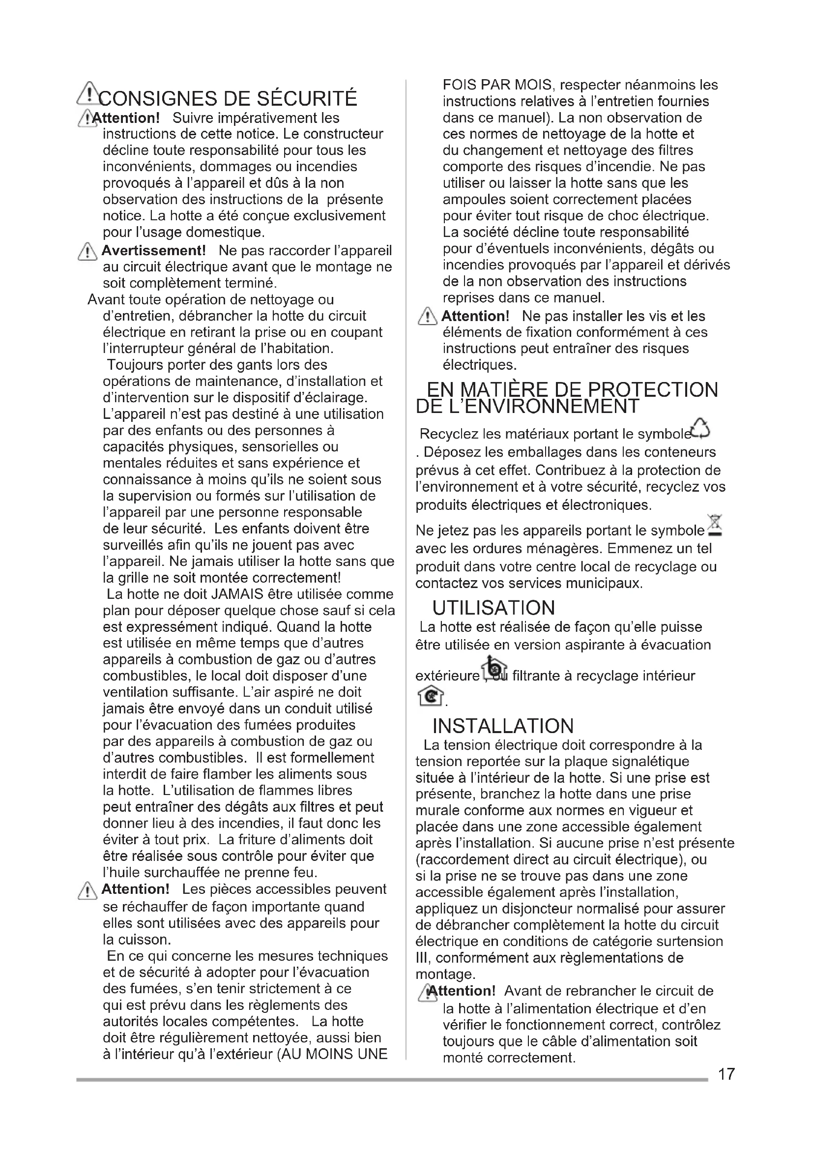 Recyclez les matériaux portant le symbole . Déposez les emballages dans les conteneurs prévus à cet effet. Contribuez à la protection de l’environnement et à votre sécurité, recyclez vos produits électriques et électroniques. Ne jetez pas les appareils portant le symbole avec les ordures ménagères. Emmenez un tel produit dans votre centre local de recyclage ou contactez vos services municipaux. UTILISATION La hotte est réalisée de façon qu’elle puisse être utilisée en version aspirante à évacuation extérieure , ou filtrante à recyclage intérieur