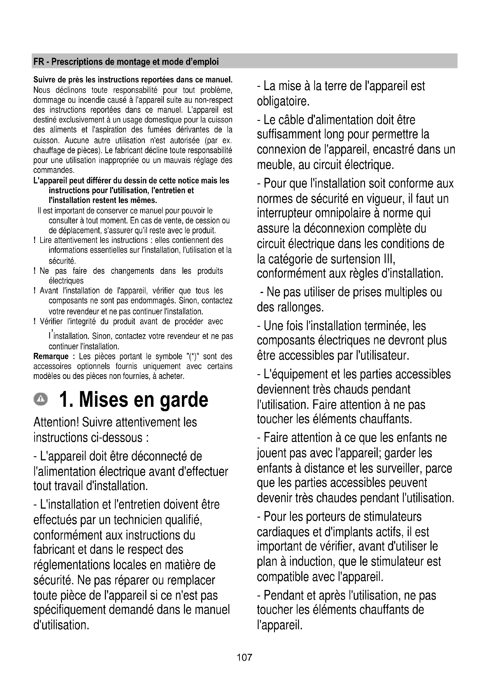 Jos ongelma ei poistu edellä mainittujen tarkistusten jälkeen, ota yhteyttä valtuutettuun tekniseen tukeen.107 FR - Prescriptions de montage et mode d’emploi Suivre de près les instructions reportées dans ce manuel. Nous déclinons toute responsabilité pour tout problème, dommage ou incendie causé à l'appareil suite au non-respect des instructions reportées dans ce manuel. L'appareil est destiné exclusivement à un usage domestique pour la cuisson des aliments et l'aspiration des fumées dérivantes de la cuisson. Aucune autre utilisation n'est autorisée (par ex. chauffage de pièces). Le fabricant décline toute responsabilité pour une utilisation inappropriée ou un mauvais réglage des commandes. L'appareil peut différer du dessin de cette notice mais les instructions pour l'utilisation, l'entretien et l'installation restent les mêmes. Il est important de conserver ce manuel pour pouvoir le consulter à tout moment. En cas de vente, de cession ou de déplacement, s'assurer qu'il reste avec le produit. ! Lire attentivement les instructions : elles contiennent des informations essentielles sur l'installation, l'utilisation et la sécurité. ! Ne pas faire des changements dans les produits électriques ! Avant l'installation de l'appareil, vérifier que tous les composants ne sont pas endommagés. Sinon, contactez votre revendeur et ne pas continuer l'installation. ! Vérifier l'integrité du produit avant de procéder avec
