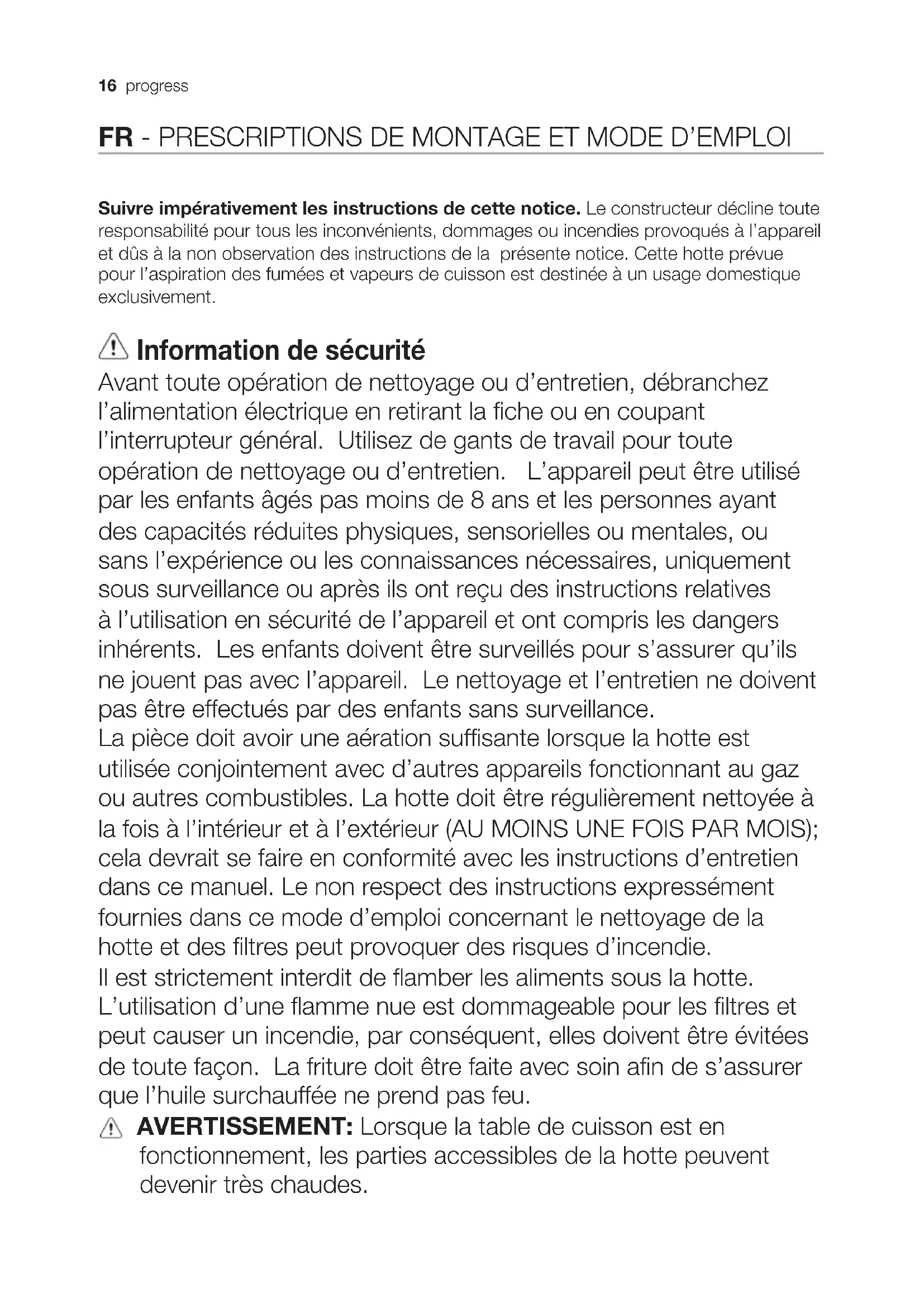fonctionnement, les parties accessibles de la hotte peuvent devenir très chaudes.progress 17 Consignes de sécurité Pour le remplacement de la lampe, utilisez uniquement le type de lampe spécifié dans la section remplacement/maintenance lampe dans ce manuel. Attention! Ne pas brancher l’appareil au réseau électrique avant que l’installation est complètement terminée. En ce qui concerne les mesures techniques et de sécurité à prendre pour l’évacuation des fumées, respectez strictement les dispositions des règlements locales. L’air d’évacuation ne doit pas être envoyé dans un conduit utilisé pour évacuer les fumées produites par les appareils de combustion de gaz ou d’autres combustibles. Ne pas utiliser ou laisser la hotte sans les lampes correctement montées, car un éventuel risque de choc électrique est possible. N’utilisez jamais la hotte sans la grille montée correctement! La hotte ne doit JAMAIS être utilisée comme une surface d’appui, sauf indication expresse. Utilisez uniquement les vis de fixation fournies avec le produit pour l’installation, ou, si non fournies, acheter le type correct de vis. Utilisez la longueur correcte pour les vis qui sont identifiées dans le Guide d’installation. En cas de doute, consultez votre centre de service agréé ou du personnel qualifié. Attention! Le défaut d’installer les vis et les dispositifs de fixation conformément à ces instructions peut entraîner des risques électriques. En matière de protection de l’environnement Recyclez les matériaux portant le symbole . Déposez les emballages dans les conteneurs prévus à cet effet. Contribuez à la protection de l’environnement et à votre sécurité, recyclez vos produits électriques et électroniques. Ne jetez pas les appareils portant le symbole avec les ordures ménagères. Emmenez un tel produit dans votre centre local de recyclage ou contactez vos services municipaux. Utilisation La hotte est réalisée de façon qu’elle puisse être utilisée en version aspirante à évacuation extérieure , ou filtrante à recyclage intérieur . Installation La tension électrique doit correspondre à la tension reportée sur la plaque signalétique située à l’intérieur de la hotte. Si une prise est présente, branchez la hotte dans une prise murale conforme aux normes en vigueur et placée dans une zone accessible également après l’installation. Si aucune prise n’est présente (raccordement direct au circuit électrique), ou si la prise ne se trouve pas dans une zone accessible également après l’installation, appliquez un disjoncteur normalisé pour assurer de débrancher complètement la hotte du circuit électrique en conditions de catégorie surtension III, conformément aux règlementations de montage. Avant de rebrancher le circuit de la hotte à l’alimentation électrique et d’en vérifier le fonctionnement correct, contrôlez toujours que le câble d’alimentation soit monté correctement.18 progress La hotte est pourvue d’un câble d’alimentation spécial; en cas de détérioration du câble, en demander un neuf au service d’assistance technique. La distance minimum entre la superficie de support des récipients sur le dispositif de cuisson et la partie la plus basse de la hotte de cuisine ne doit pas être inférieure à 50cm dans le cas de cuisinières électriques et de 65cm dans le cas de cuisinières à gaz ou mixtes. Si les instructions d’installation du disposi- tif de cuisson au gaz spécient une plus grande distance, il faut en tenir compte. Fonctionnement Utiliser la puissance d’aspiration maximum en cas de concentration très importante des vapeurs de cuisson. Nous conseillons d’allumer la hotte 5 minutes avant de commencer la cuisson et de la faire fonctionner encore pendant 15 minutes environ après avoir terminé la cuisson.