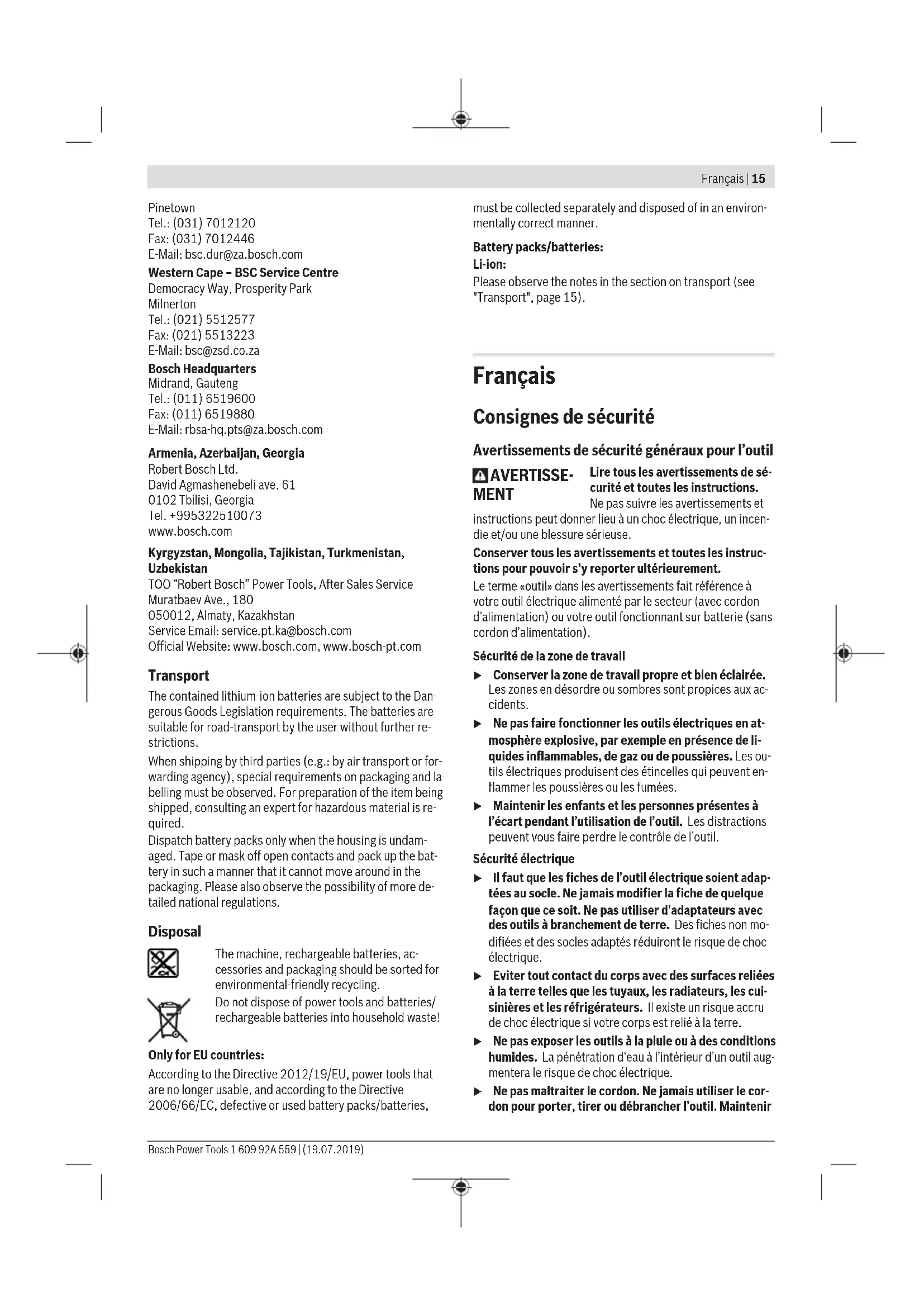 Le niveau de vibration indiqué dans cette notice d’utilisation a été mesuré à l’aide d’un procédé de mesure normaliséet peut être utilisé pour effectuer une comparaison entre outils électroportatifs. Il est également approprié pour une estima- tion préliminaire de la charge vibratoire. Le niveau de vibration s'applique pour les utilisations princi- pales de l’outil électroportatif. En cas d’utilisation de l’outil électroportatif pour d’autres applications, avec d’autres ac- cessoires ou bien en cas d’entretien non approprié, le niveau sonore peut être différent. Il peut en résulter une nette aug- mentation de la charge vibratoire pendant toute la durée de travail. Pour une estimation précise de la charge vibratoire, il est re- commandé de prendre aussi en considération les périodes pendant lesquelles l’appareil est éteint ou en fonctionne- ment, mais pas vraiment utilisé. Ceci peut réduire considéra- blement la charge vibratoire pendant toute la durée de tra- vail. Prévoyez des mesures de protection supplémentaires per- mettant de protéger l’utilisateur de l’effet des vibrations, par exemple : maintenance de l’outil électroportatif et des acces- soires de travail, maintien des mains au chaud, organisation des procédures de travail. Montage Recharge de l’accu u N’utilisez que les chargeurs indiqués dans les Caracté- ristiques techniques. Ils sont les seuls à être adaptés à l’accu Lithium-Ion de votre outil électroportatif. Remarque: L’accu est fourni partiellement chargé. Pour ob- tenir les performances maximales, chargez l’accu jusqu’à sa pleine capacité avant la première utilisation. L’accu Lithium-Ion peut être rechargé à tout moment, sans risquer de réduire sa durée de vie. Le fait d’interrompre le processus de charge n’endommage pas l’accu. L’accu Lithium-Ion est protégé contre une décharge com- plète par «Electronic Cell Protection (ECP)» (l’électronique de protection des cellules). Lorsque l’accu est déchargé, l’outil électroportatif s’arrête grâce à un dispositif d’arrêt de protection: l’accessoire de travail ne tourne plus. u Après l’arrêt automatique de l’outil électroportatif, n’appuyez plus sur l’interrupteur Marche/Arrêt. L’accu pourrait être endommagé. Respectez les indications concernant l’élimination. Retrait de l’accu (voir figure A) Pour retirer l’accu (4), appuyez sur les boutons de déver- rouillage (5) et retirez l’accu de l’outil électroportatif. Ne for- cez pas. Indicateur d’état de charge de l’accu LED Capacité Lumière permanente 3x verte 60 – 100% Lumière permanente 2x verte 30 – 60% Lumière permanente 1x verte 10 – 30% Lumière clignotante lente 1x verte 0 – 10% Montage du dispositif de protection u Retirez l’accu de l’appareil électroportatif avant toute intervention (opérations d’entretien/de maintenance, changement d’accessoire, etc.) ainsi que lors de son transport et rangement. Il y a sinon risque de blessure lorsqu’on appuie par mégarde sur l’interrupteur Marche/ Arrêt. Remarque : En cas de cassure de la meule ou du disque pen- dant l’utilisation ou de détérioration des dispositifs de fixa- tion sur le capot de protection/l’outil électroportatif, en- voyez sans tarder l’outil électroportatif dans un centre de service après-vente. Pour les adresses, reportez-vous à la section « Service après-vente et conseil utilisateurs ». Capot de protection spécial tronçonnage u Pour les opérations de tronçonnage au moyen d’abra- sifs agglomérés, toujours utiliser le capot de protec- tion spécial tronçonnage (10). u Lors du tronçonnage de matières minérales, veillez à assurer une aspiration suffisante des poussières. Montage du capot de protection (voir figure B) Emboîtez le capot de protection spécial tronçonnage (10) sur le capot de protection spécial meulage (7) jusqu’à ce qu’il s’enclenche. Réglage du capot de protection (voir figure B) Faites pivoter le capot de protection dans la position voulue et enclenchez-le. Aucune clé n’est requise pour cela. Montage des accessoires de ponçage u Retirez l’accu de l’appareil électroportatif avant toute intervention (opérations d’entretien/de maintenance, changement d’accessoire, etc.) ainsi que lors de son transport et rangement. Il y a sinon risque de blessure lorsqu’on appuie par mégarde sur l’interrupteur Marche/ Arrêt. u Attendez que les meules à ébarber et les disques à tronçonner aient refroidi avant de les toucher. Les meules deviennent brûlantes pendant le travail. Nettoyez la broche d’entraînement (8) et toutes les pièces à monter. 1 609 92A 559 | (19.07.2019) Bosch Power ToolsFrançais | 21 Pour serrer ou desserrer les disques ou meules, poussez le bouton de blocage de broche (2) vers l’avant tout en tour- nant la meule / le disque pour bloquer la broche. u N’actionnez la touche de blocage de broche que lorsque la broche d’entraînement est à l’arrêt. L’outil électroportatif risque sinon d’être endommagé. Meule / disque à tronçonner N’utilisez que des meules et disques aux dimensions pres- crites. Le diamètre de l’alésage central doit être adapté au flasque d’entraînement. N’utilisez ni raccords réducteurs ni adaptateurs. Lors de l’utilisation de disques à tronçonner diamantés, veillez à ce que la flèche de sens de rotation sur le disque et le sens de rotation de l’outil électroportatif (voir la flèche de sens de rotation sur le carter) coïncident. L’ordre de montage est visible sur la page avec les gra- phiques. Pour retirer un disque / une meule, poussez le bouton de blocage de broche (2) vers l’avant tout en tournant la meule / le disque (12), pour bloquer la broche (8) (voir fi- gure C1). À l’aide d’une clé mâle pour vis six pans creux (13), retirez la vis de serrage et la rondelle (11) et dégagez le disq