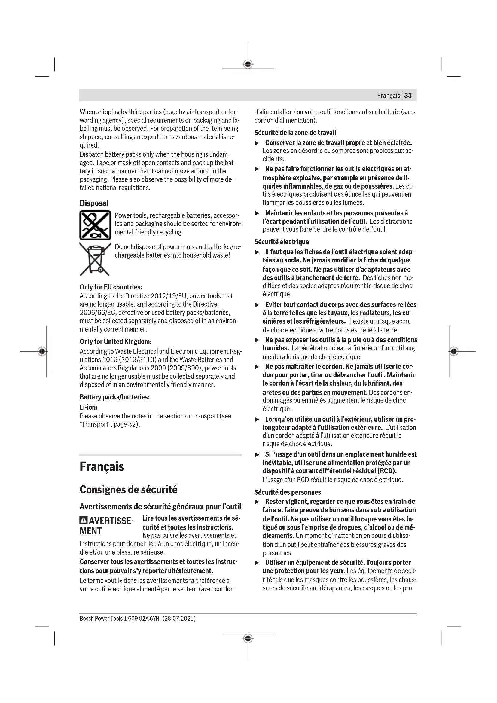 Low Energy Module GCY30-4 is equipped with a radio interface. Local operating restrictions, e.g. in aircraft or hospit- als, must be observed. u Exercise caution when cutting slots in structural walls; see the "Information on structural design" section. u Clamp the workpiece if it is not secure under its own weight. u Do not load the power tool so heavily that it comes to a stop. u If the power tool has been subjected to a heavy load, continue to run it at no-load for several minutes to cool down the accessory. u Do not use the power tool with a cut-off stand. u Do not touch grinding and cutting discs until they have cooled down. The discs can become very hot while work- ing. If the power tool becomes electrostatically charged, the built-in electronics will switch the power tool off. Press the on/off switch (6) again to restart the power tool. Rough grinding u Never use cutting discs for rough grinding. The best rough grinding results are achieved with a set angle of 30° to 40°. Move the power tool back and forth with mod- erate pressure. This will ensure that the workpiece does not become too hot or discolour and that grooves are not formed. Flap disc The flap disc (accessory) enables you to machine curved surfaces and profiles. Flap discs have a considerably longer service life, lower noise levels and lower sanding temperatures than conven- tional grinding discs. Bosch Power Tools 1 609 92A 6YN | (28.07.2021)32 | English Cutting metal u Always use the protective guard for cutting (17) when cutting bonded abrasives. When carrying out abrasive cutting, use a moderate feed that is suited to the material being machined. Do not exert pressure on the cutting disc and do not tilt or swing the power tool. Do not attempt to reduce the speed of a cutting disc coming to a stop by applying pressure from the side. The power tool must always work in an up-grinding mo- tion. Otherwise there is a risk that it will be pushed uncontrolled out of the cut. For best results when cut- ting profiles and rectangular tubing, start at the smallest cross section. Cutting Stone (see figure A) u Provide sufficient dust extraction when cutting stone. u Wear a dust mask. u The power tool may be used only for dry cutting/grind- ing. For best results when cutting stone, use a diamond cutting disc. When using the extraction guard for cutting with a cutting guide (27), the vacuum cleaner must be approved for vacu- uming stone dust. Suitable vacuum cleaners are available from Bosch. Switch on the power tool and position it with the front part of the cutting guide on the workpiece. Move the power tool with a moderate feed motion that is suited to the material be- ing machined. When cutting especially hard materials such as con- crete with a high pebble content, the diamond cutting disc can overheat and become damaged as a result. This is clearly indicated by circular sparking, rotating with the dia- mond cutting disc. If this happens, stop cutting and allow the diamond cutting disc to cool down by running the power tool for a short time at maximum speed with no load. If work is noticeably slower and with circular sparking, this indicates that the diamond cutting disc that has become dull. You can resharpen the disc by briefly cutting into abras- ive material (e.g. lime-sand brick). Information on structural design Slots in load-bearing walls are subject to DIN 1053 part 1 or country-specific regulations. These regulations must be ob- served under all circumstances. Seek advice from the re- sponsible structural engineer, architect or construction su- pervisor before starting work. Recommendations for optimal handling of the battery Protect the battery against moisture and water. Only store the battery only within a temperature range of -20 to 50 °C. Do not leave the battery in your car in the summer, for example. Occasionally clean the ventilation slots on the battery using a soft brush that is clean and dry. A significantly reduced operating time after charging indic- ates that the battery has deteriorated and must be replaced. Follow the instructions on correct disposal. Maintenance and Service Maintenance and Cleaning u Remove the battery from the power tool before carry- ing out work on the power tool (e.g. maintenance, changing tool, etc.). The battery should also be re- moved for transport and storage. There is risk of injury from unintentionally pressing the on/off switch. u To ensure safe and efficient operation, always keep the power tool and the ventilation slots clean. Store and handle the accessories carefully. After-Sales Service and Application Service Our after-sales service responds to your questions concern- ing maintenance and repair of your product as well as spare parts. You can find explosion drawings and information on spare parts at: www.bosch-pt.com The Bosch product use advice team will be happy to help you with any questions about our products and their accessor- ies. In all correspondence and spare parts orders, please always include the 10‑digit article number given on the nameplate of the product. Great Britain Robert Bosch Ltd. (B.S.C.) P.O. Box 98 Broadwater Park North Orbital Road Denham Uxbridge UB 9 5HJ At www.bosch-pt.co.uk you can order spare parts or arrange the collection of a product in need of servicing or repair. Tel. Service: (0344) 7360109 E-Mail: boschservicecentre@bosch.com You can find further service addresses at: www.bosch-pt.com/serviceaddresses Transport The contained lithium-ion batteries are subject to the Dan- gerous Goods Legislation requirements. The batteries are suitable for road-transport by the user without further re- strictions. 1 609 92A 6YN | (28.07.2021) Bosch Power ToolsFrançais | 33 When shipping by third parties (e.g.: by air transport or for- warding agency), special requirements on packaging and la- belling must be observed. For preparation of the item being shipped, consulting an expert for hazardous material is re- quired. Dispatch battery packs o