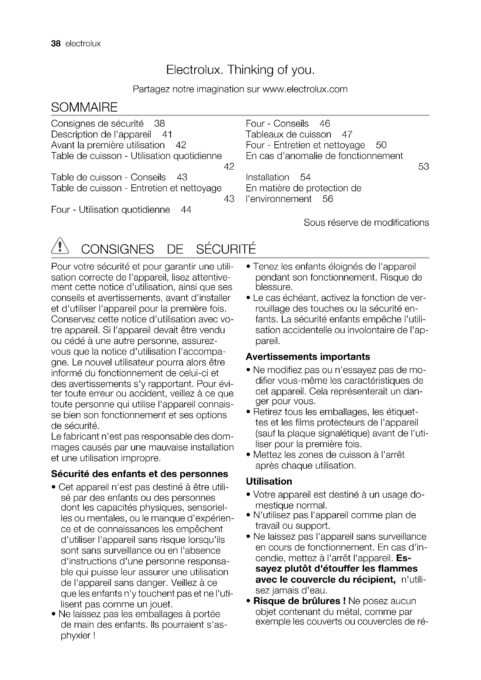 Installation 54 En matière de protection de l'environnement 56 Sous réserve de modifications