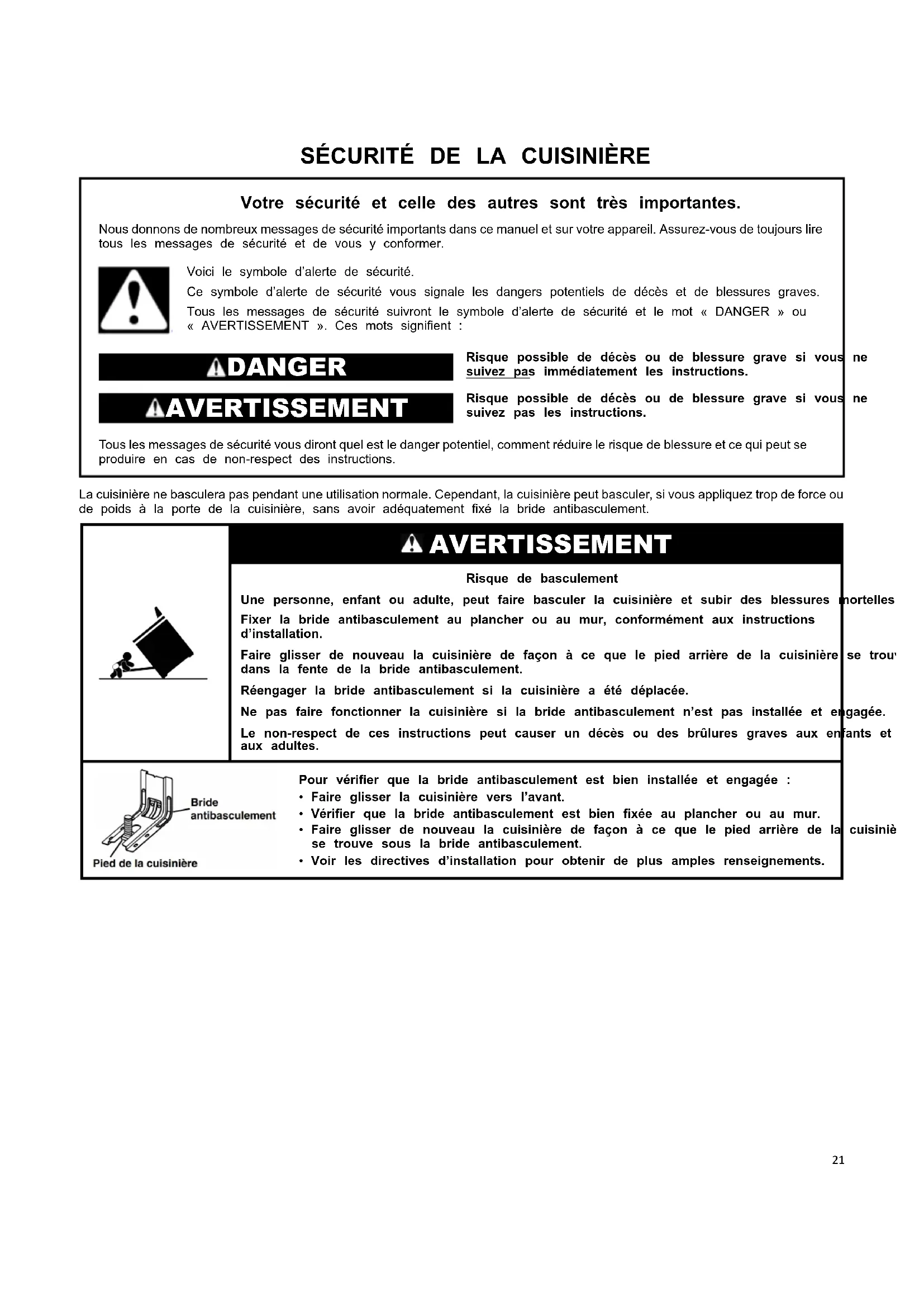 Votre sécurité et celle des autres sont très importantes. Nous donnons de nombreux messages de sécurité importants dans ce manuel et sur votre appareil. Assurez-vous de toujours lire tous les messages de sécurité et de vous y conformer. Voici le symbole d’alerte de sécurité. Ce symbole d’alerte de sécurité vous signale les dangers potentiels de décès et de blessures graves. Tous les messages de sécurité suivront le symbole d’alerte de sécurité et le mot « DANGER » ou « AVERTISSEMENT ». Ces mots signifient : DANGER Risque possible de décès ou de blessure grave si vous ne suivez pas immédiatement les instructions. AVERTISSEMENT Risque possible de décès ou de blessure grave si vous ne suivez pas les instructions. Tous les messages de sécurité vous diront quel est le danger potentiel, comment réduire le risque de blessure et ce qui peut se produire en cas de non-respect des instructions. La cuisinière ne basculera pas pendant une utilisation normale. Cependant, la cuisinière peut basculer, si vous appliquez trop de force ou de poids à la porte de la cuisinière, sans avoir adéquatement fixé la bride antibasculement. AVERTISSEMENT Risque de basculement Une personne, enfant ou adulte, peut faire basculer la cuisinière et subir des blessures mortelles. Fixer la bride antibasculement au plancher ou au mur, conformément aux instructions d’installation. Faire glisser de nouveau la cuisinière de façon à ce que le pied arrière de la cuisinière se trouve dans la fente de la bride antibasculement. Réengager la bride antibasculement si la cuisinière a été déplacée. Ne pas faire fonctionner la cuisinière si la bride antibasculement n’est pas installée et engagée. Le non-respect de ces instructions peut causer un décès ou des brûlures graves aux enfants et aux adultes. Pour vérifier que la bride antibasculement est bien installée et engagée :