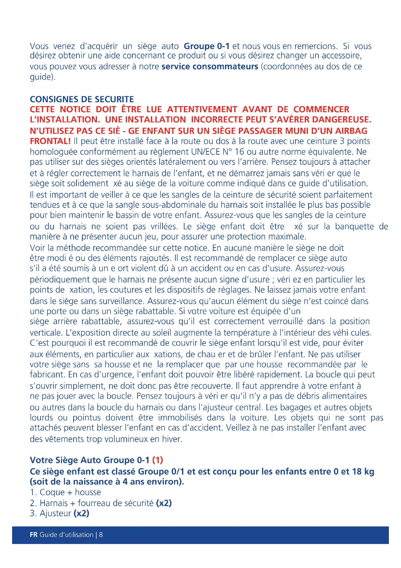 CETTE NOTICE DOIT ÊTRE LUE ATTENTIVEMENT AVANT DE COMMENCER L’INSTALLATION. UNE INSTALLATION INCORRECTE PEUT S’AVÉRER DANGEREUSE. N’UTILISEZ PAS CE SIÈ - GE ENFANT SUR UN SIÈGE PASSAGER MUNI D’UN AIRBAG FRONTAL! Il peut être installé face à la route ou dos à la route avec une ceinture 3 points homologuée conformément au règlement UN/ECE N° 16 ou autre norme équivalente. Ne pas utiliser sur des sièges orientés latéralement ou vers l’arrière. Pensez toujours à attacher et à régler correctement le harnais de l’enfant, et ne démarrez jamais sans véri er que le siège soit solidement xé au siège de la voiture comme indiqué dans ce guide d’utilisation. Il est important de veiller à ce que les sangles de la ceinture de sécurité soient parfaitement tendues et à ce que la sangle sous-abdominale du harnais soit installée le plus bas possible pour bien maintenir le bassin de votre enfant. Assurez-vous que les sangles de la ceinture ou du harnais ne soient pas vrillées. Le siège enfant doit être xé sur la banquette de manière à ne présenter aucun jeu, pour assurer une protection maximale. Voir la méthode recommandée sur cette notice. En aucune manière le siège ne doit être modi é ou des éléments rajoutés. Il est recommandé de remplacer ce siège auto s’il a été soumis à un e ort violent dû à un accident ou en cas d’usure. Assurez-vous périodiquement que le harnais ne présente aucun signe d’usure ; véri ez en particulier les points de xation, les coutures et les dispositifs de réglages. Ne laissez jamais votre enfant dans le siège sans surveillance. Assurez-vous qu’aucun élément du siège n’est coincé dans une porte ou dans un siège rabattable. Si votre voiture est équipée d’un siège arrière rabattable, assurez-vous qu’il est correctement verrouillé dans la position verticale. L’exposition directe au soleil augmente la température à l’intérieur des véhi cules. C’est pourquoi il est recommandé de couvrir le siège enfant lorsqu’il est vide, pour éviter aux éléments, en particulier aux xations, de chau er et de brûler l’enfant. Ne pas utiliser votre siège sans sa housse et ne la remplacer que par une housse recommandée par le fabricant. En cas d’urgence, l’enfant doit pouvoir être libéré rapidement. La boucle qui peut s’ouvrir simplement, ne doit donc pas être recouverte. Il faut apprendre à votre enfant à ne pas jouer avec la boucle. Pensez toujours à véri er qu’il n’y a pas de débris alimentaires ou autres dans la boucle du harnais ou dans l’ajusteur central. Les bagages et autres objets lourds ou pointus doivent être immobilisés dans la voiture. Les objets qui ne sont pas attachés peuvent blesser l’enfant en cas d’accident. Veillez à ne pas installer l’enfant avec des vêtements trop volumineux en hiver. Votre Siège Auto Groupe 0-1 (1) Ce siège enfant est classé Groupe 0/1 et est conçu pour les enfants entre 0 et 18 kg (soit de la naissance à 4 ans environ).