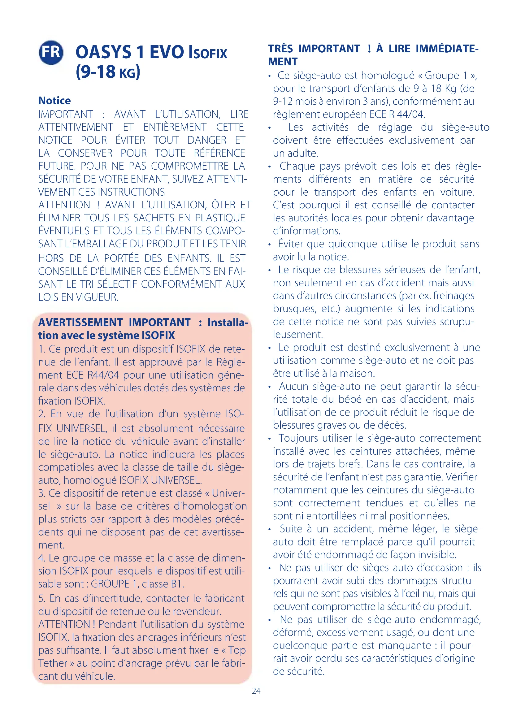 - Le Siège-auto doit être installé avec le sys- tème ISOFIX dans les positions indiquées sur la notice de la voiture. ATTENTION! Si la notice du véhicule permet d’installer l’ISOFIX du siège-auto sur le siège avant, pour plus de sécurité, il est conseillé de reculer le plus possible le siège en tenant compte de la présence d’autres passagers sur le siège arrière et de régler son dossier dans la position la plus verticale possible. Si le siège avant est doté d’un airbag frontal, il est décon- seillé d’installer le siège-auto sur ce siège. En cas d’installation sur un siège quelconque protégé par un airbag, toujours consulter la notice du véhicule.