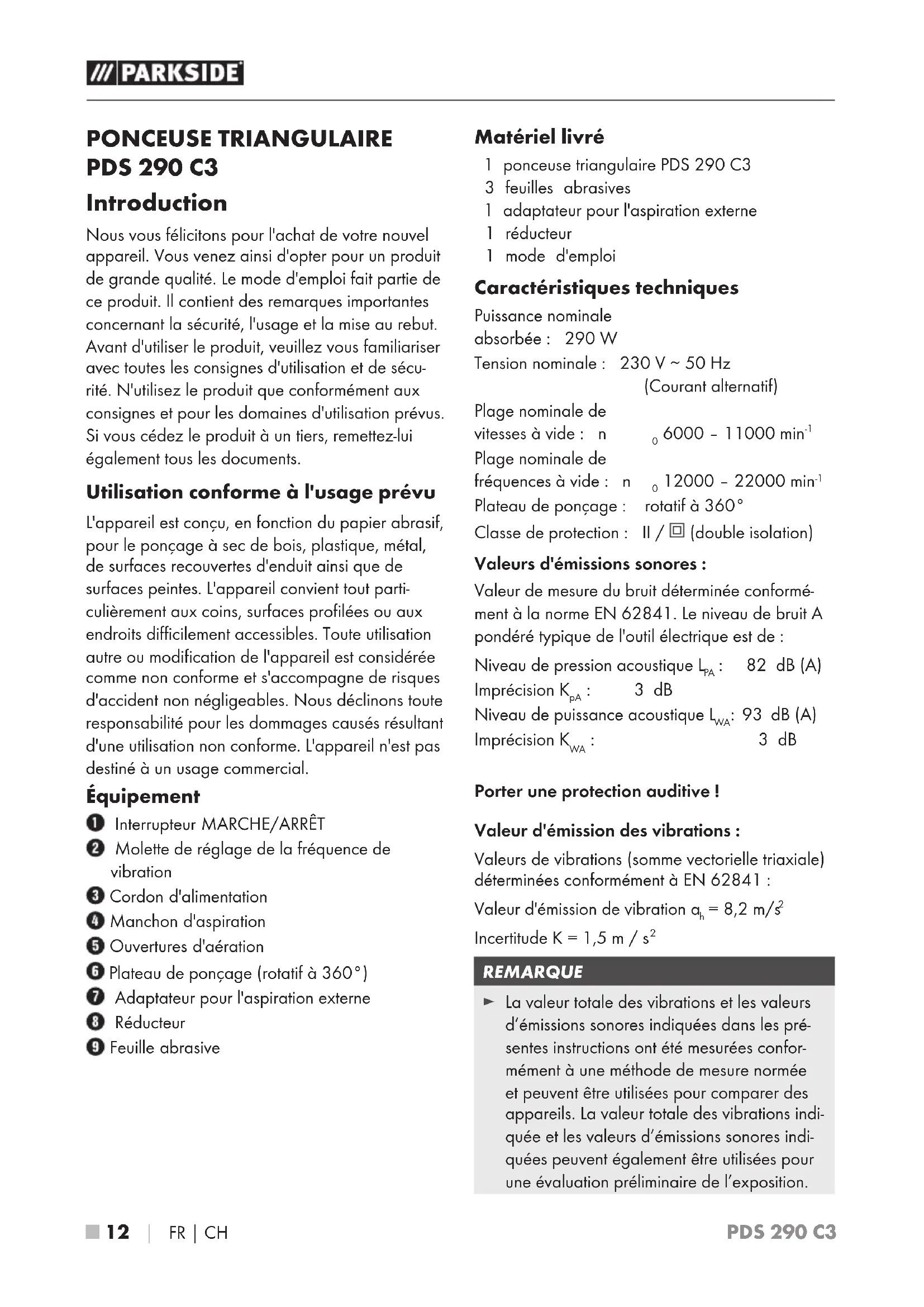 - Traduction de la déclaration de conformité originale PDS 290 C3 ■ 12 │ FR│CH PONCEUSE TRIANGULAIRE PDS 290 C3 Introduction Nous vous félicitons pour l'achat de votre nouvel appareil. Vous venez ainsi d'opter pour un produit de grande qualité. Le mode d'emploi fait partie de ce produit. Il contient des remarques importantes concernant la sécurité, l'usage et la mise au rebut. Avant d'utiliser le produit, veuillez vous familiariser avec toutes les consignes d'utilisation et de sécu- rité. N'utilisez le produit que conformément aux consignes et pour les domaines d'utilisation prévus. Si vous cédez le produit à un tiers, remettez-lui également tous les documents. Utilisation conforme à l'usage prévu L'appareil est conçu, en fonction du papier abrasif, pour le ponçage à sec de bois, plastique, métal, de surfaces recouvertes d'enduit ainsi que de surfaces peintes. L'appareil convient tout parti- culièrement aux coins, surfaces profilées ou aux endroits difficilement accessibles. Toute utilisation autre ou modification de l'appareil est considérée comme non conforme et s'accompagne de risques d'accident non négligeables. Nous déclinons toute responsabilité pour les dommages causés résultant d'une utilisation non conforme. L'appareil n'est pas destiné à un usage commercial. Équipement Interrupteur MARCHE/ARRÊT Molette de réglage de la fréquence de vibration Cordon d'alimentation Manchon d'aspiration Ouvertures d'aération Plateau de ponçage (rotatif à 360°) Adaptateur pour l'aspiration externe Réducteur Feuille abrasive Matériel livré 1 ponceuse triangulaire PDS 290 C3 3 feuilles abrasives 1 adaptateur pour l'aspiration externe 1 réducteur 1 mode d'emploi Caractéristiques techniques Puissance nominale absorbée : 290 W Tension nominale : 230 V ∼ 50 Hz (Courant alternatif) Plage nominale de vitesses à vide : n p. 20